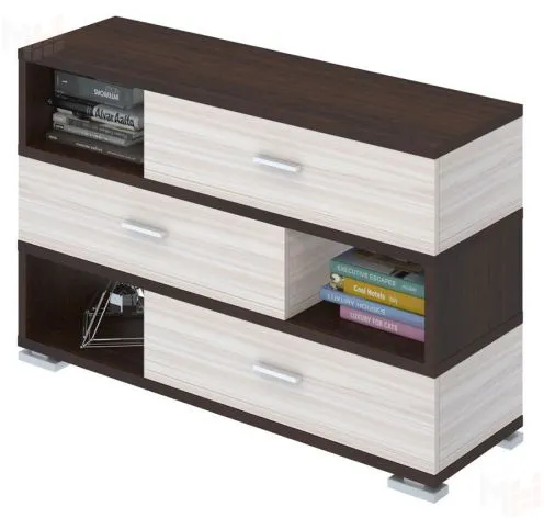 В стеллаже три открытых ниши для хранения и три выдвижных ящика.Доступна вариация со скругленными углами. -