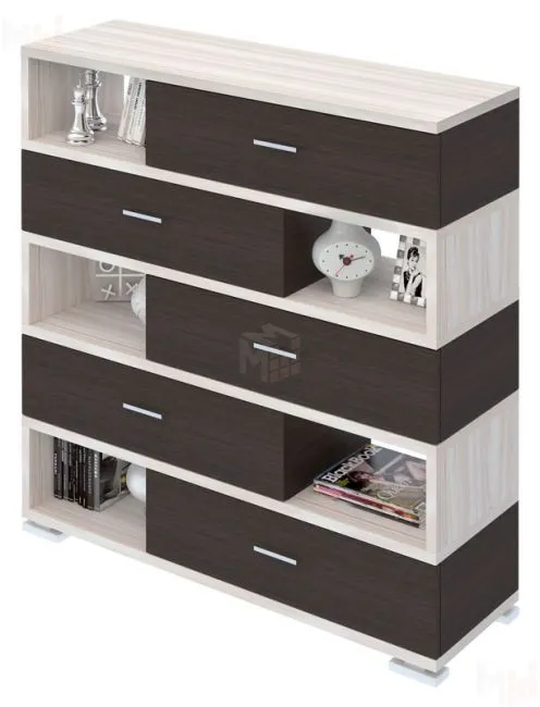 В стеллаже пять открытых ниш для хранения и пять выдвижных ящиков. Доступна вариация со скругленными углами. -
