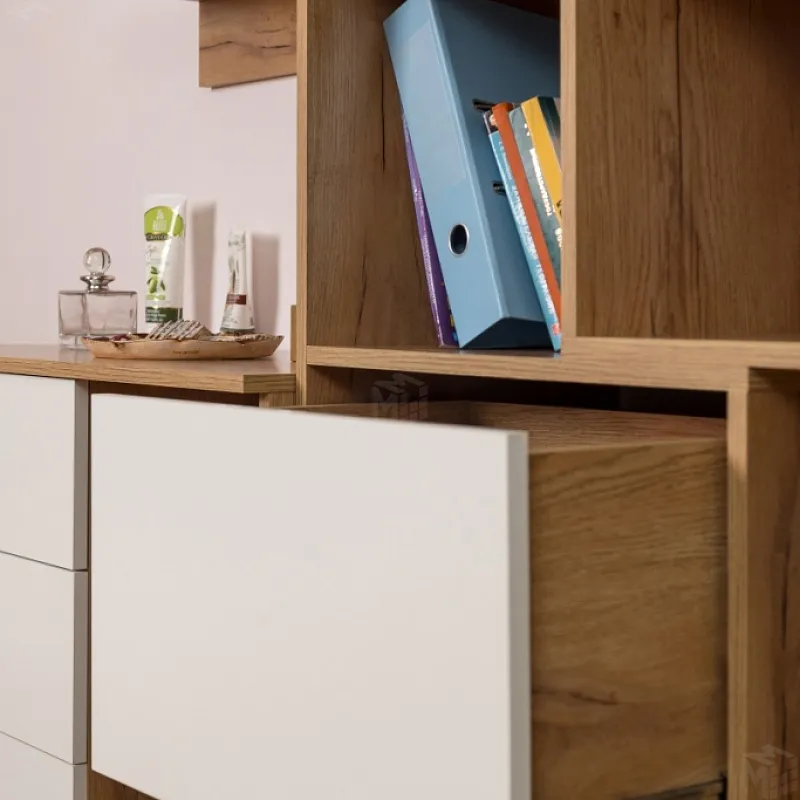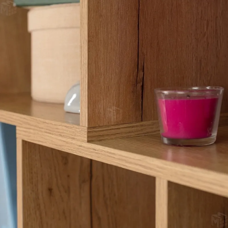 Установите его как самостоятельный модуль или между шкафами, регулируя общую ширину шкафной группы. Также такой стеллаж отлично подойдет и для размещения в нише. С его помощью делать перестановку в комнате легко и просто!