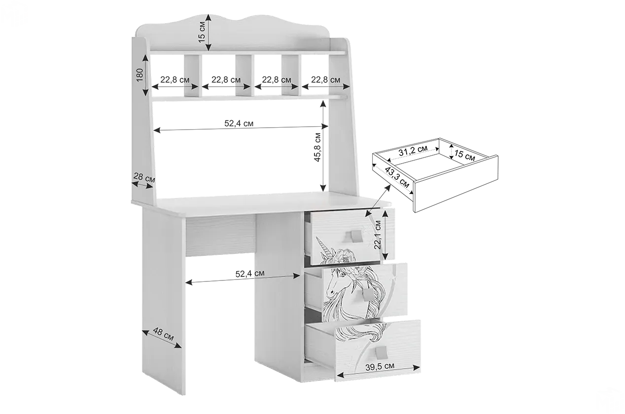 Функциональность: Два выдвижных ящика на роликовых направляющих, изящная надстройка для хранения.