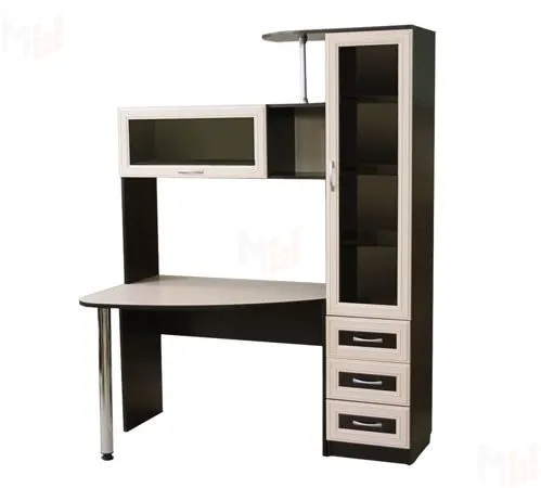 Включает в себя книжный пенал со стеклянной дверцей и выкатными ящиками.