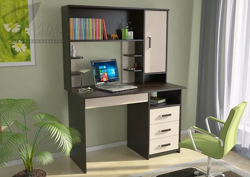 Стол имеет выкатные ящики в тумбе и под столешницей. В набор также входит надстройка.