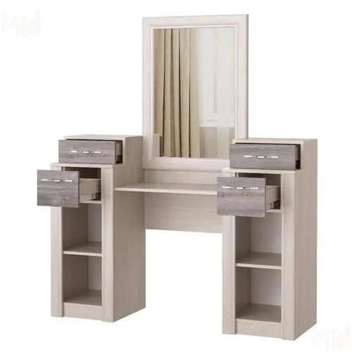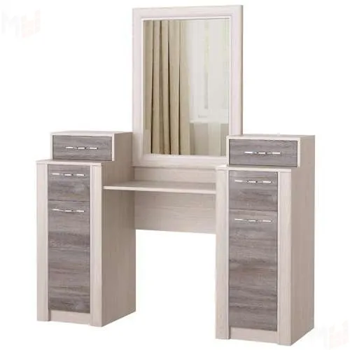 Стол косметический с зеркалом "Октава" 2-створчатый с 4-мя ящиками. Устанавливается стильная металлическая ручка, декор "тёмный никель". Периметр стола обрамлён профилем MDF оригинальной формы с патиной (окраской фасок) серебристого цвета. Направляющие шариковые, полного выдвижения.