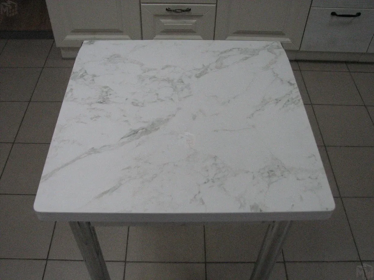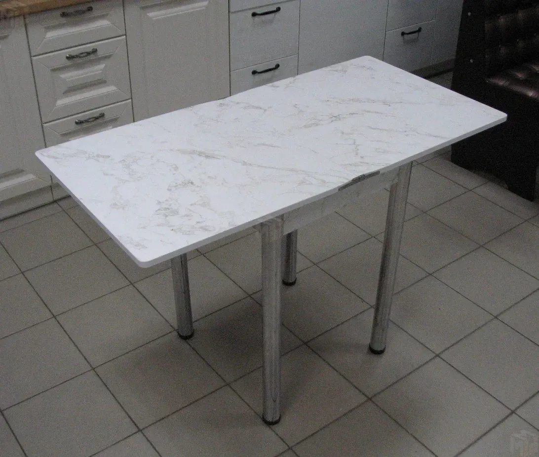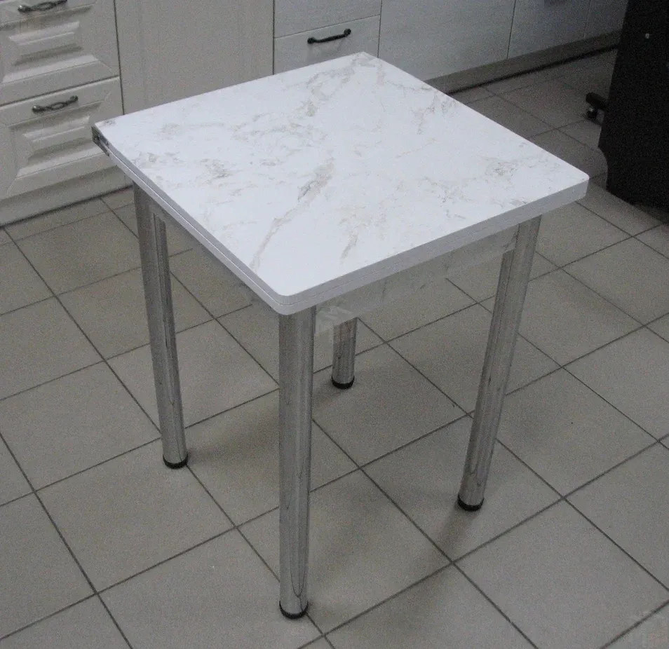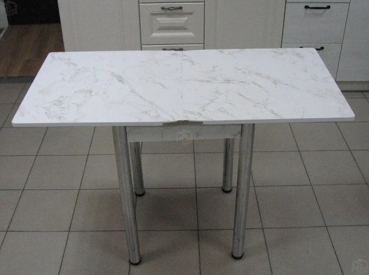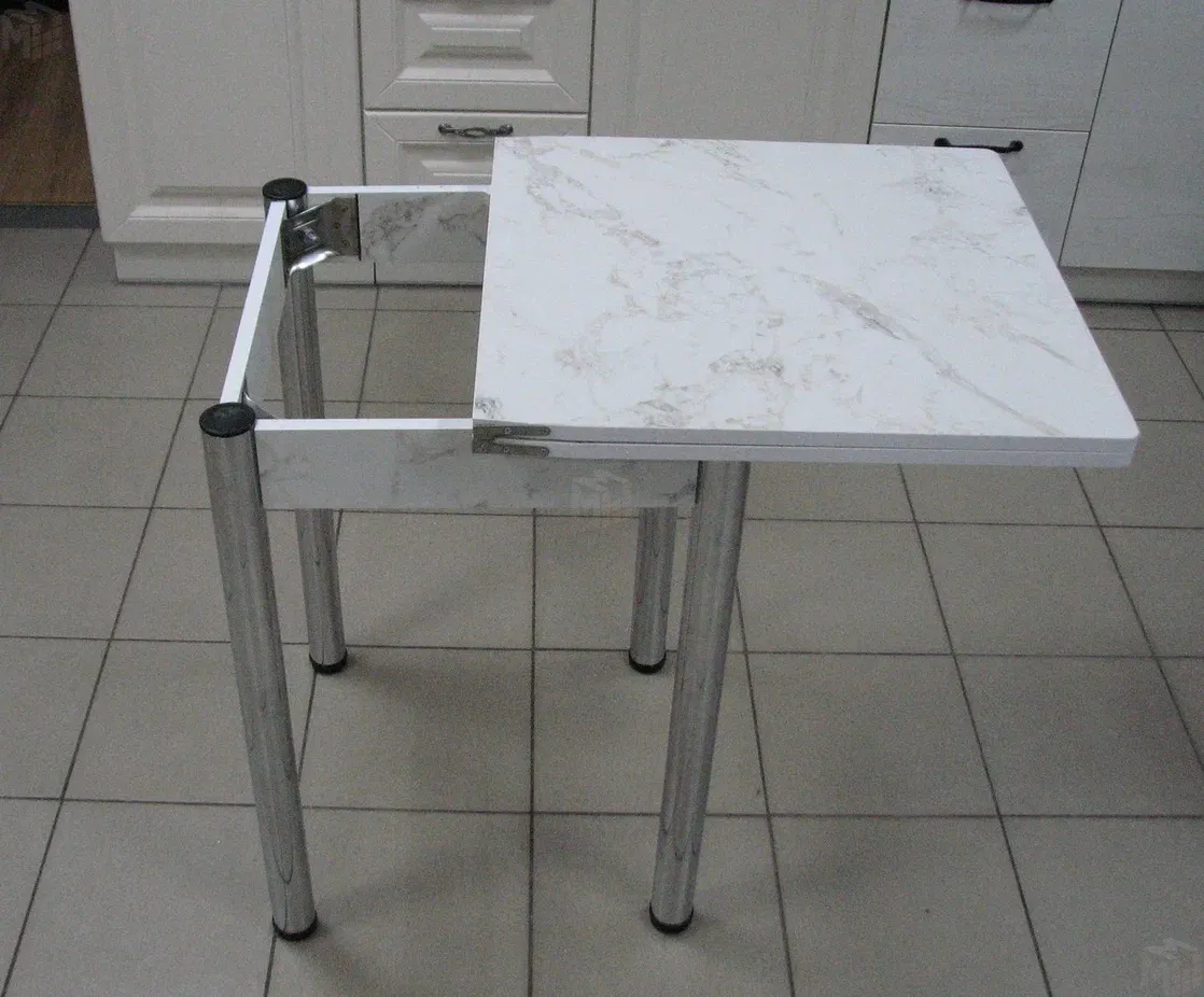 Стол на металлических хромированных ножках. Столешница ЛДСП сабия. Размер столешницы 580*580 мм, в разложенном виде 580*1160 мм.