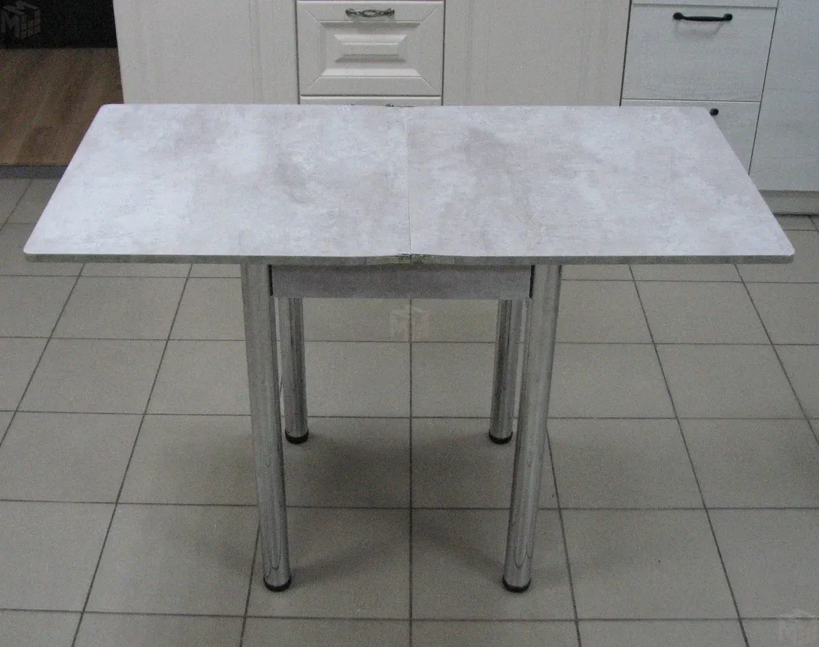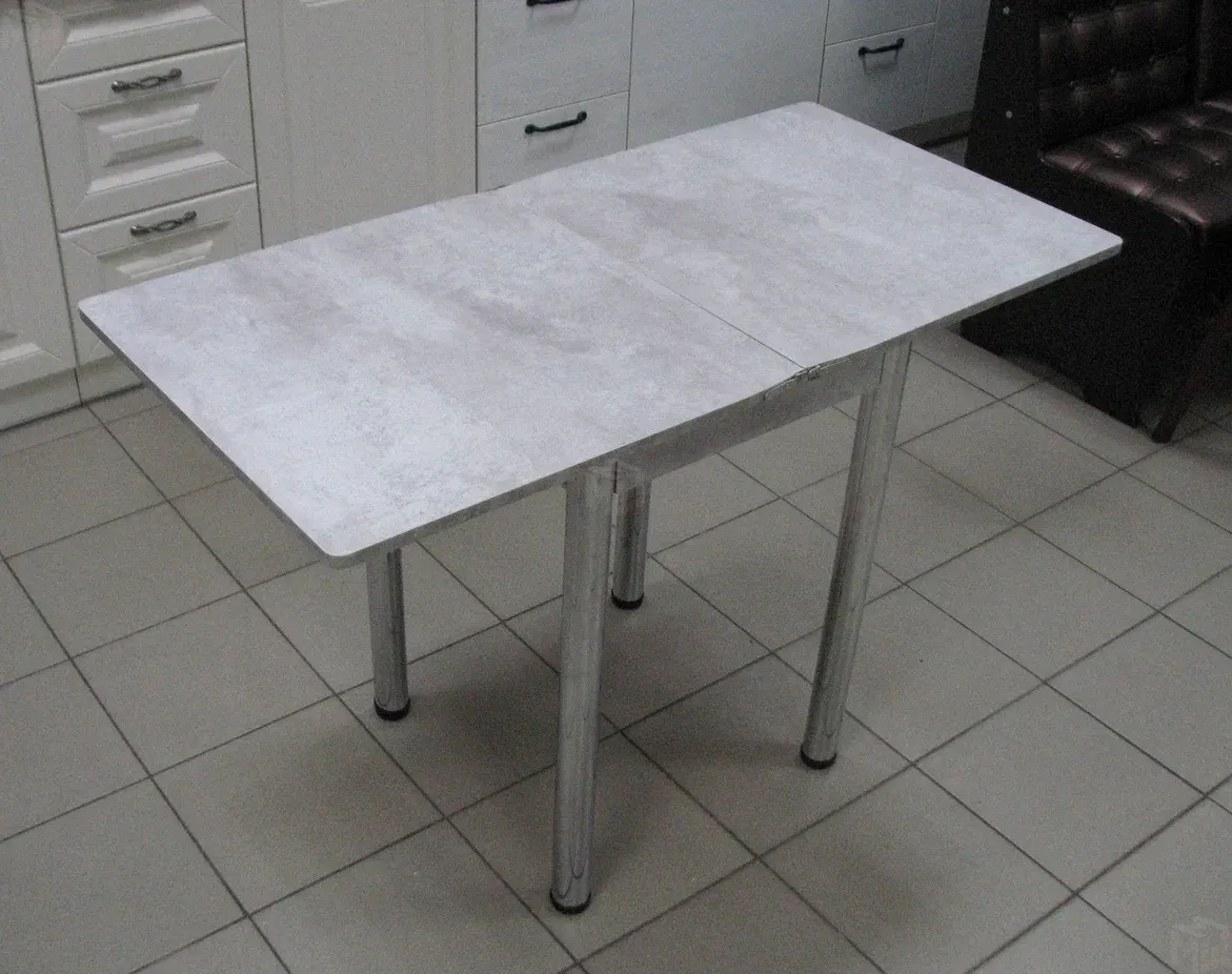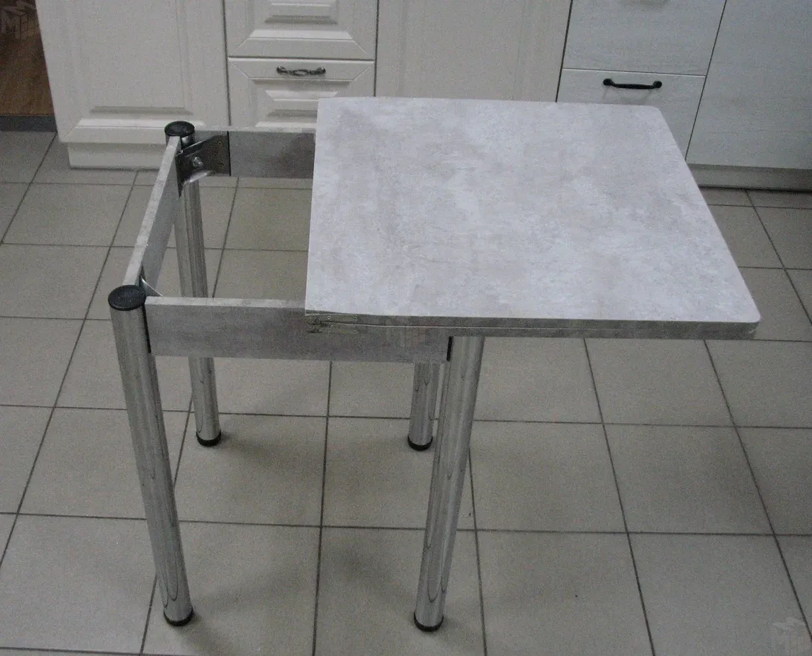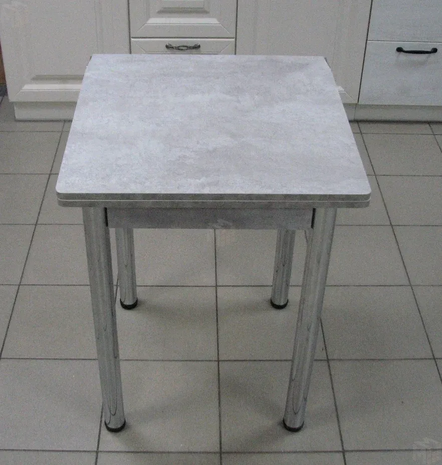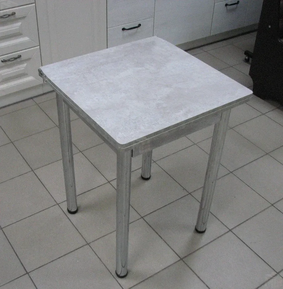 Стол на металлических хромированных ножках. Столешница ЛДСП цемент светлый. Размер столешницы 580*580 мм, в разложенном виде 580*1160 мм.