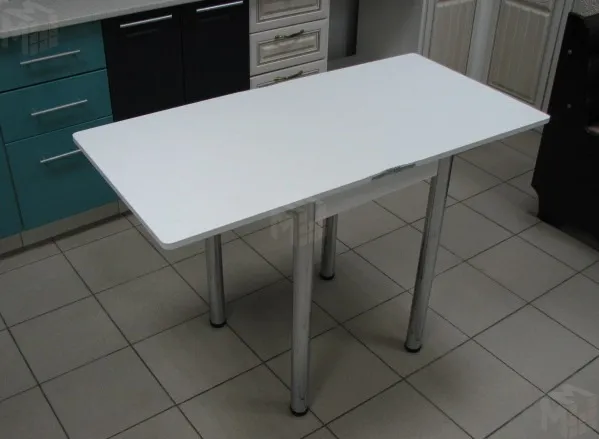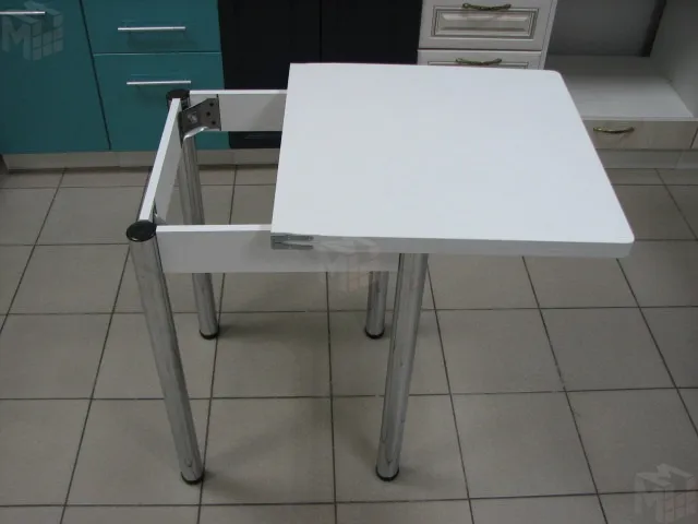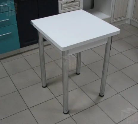 Стол на металлических хромированных ножках. Столешница ЛДСП белый. Размер столешницы 580*580 мм, в разложенном виде 580*1160 мм.