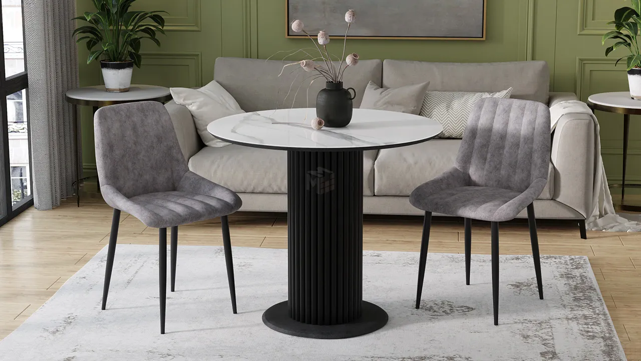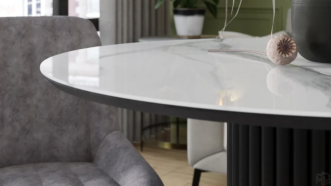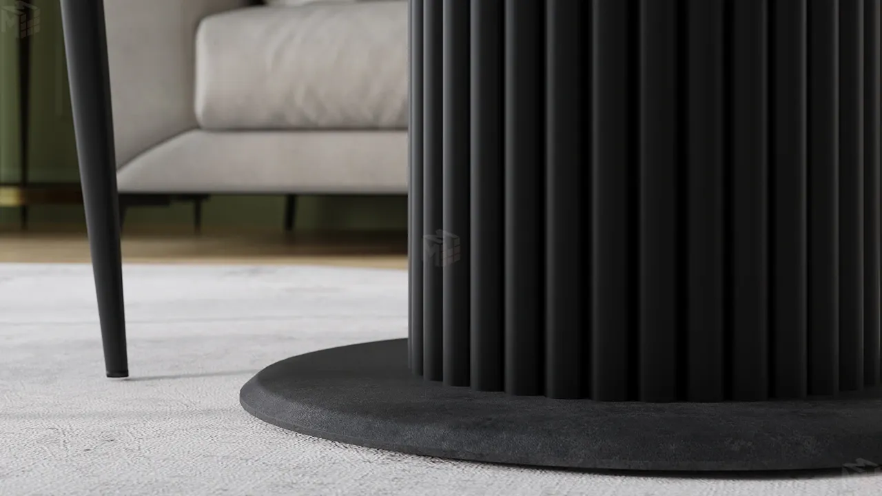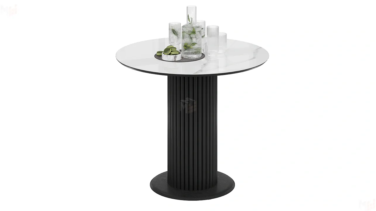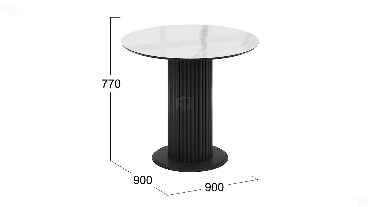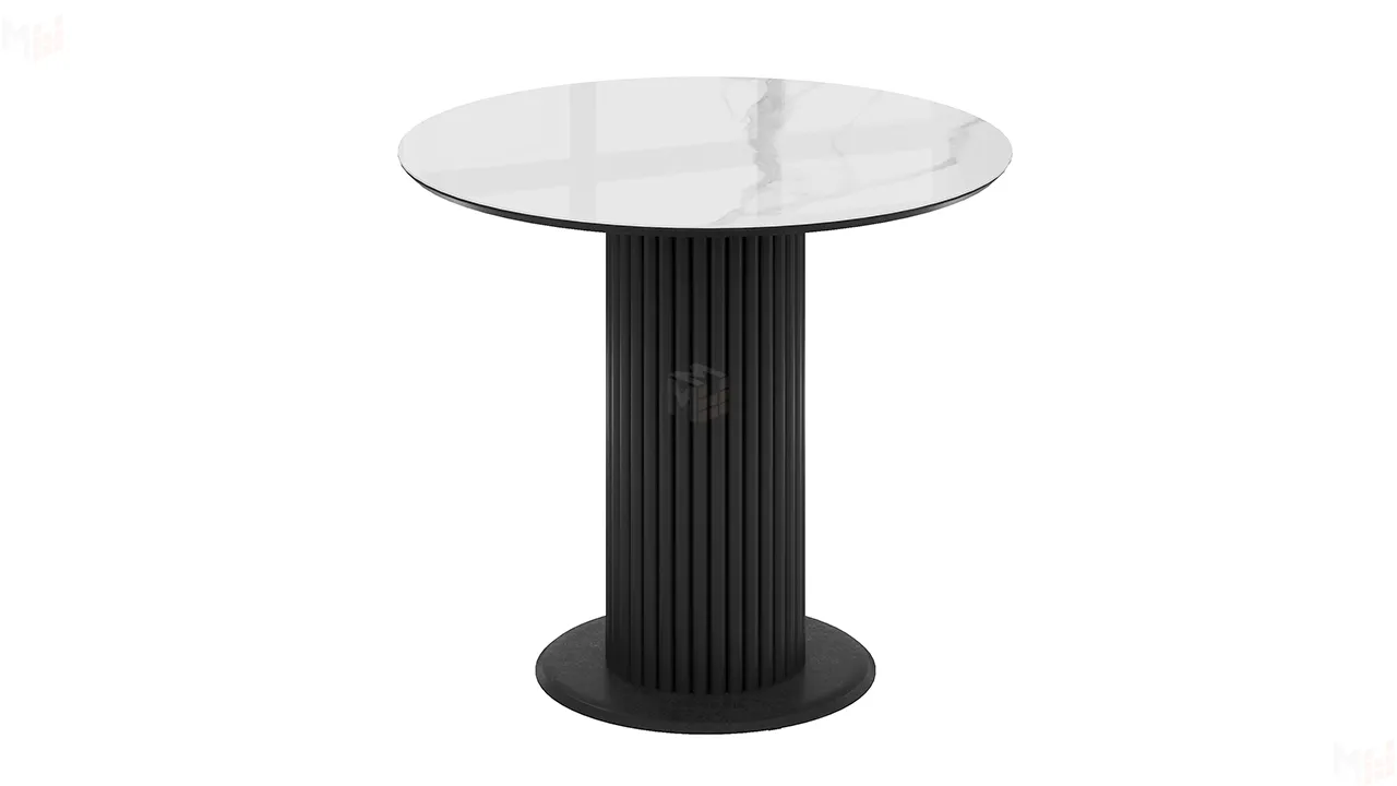 Нераздвижная столешница изготовлена из МДФ 16 мм в пленке ПВХ и закаленного глянцевого стекла 4 мм. Опора цилиндрической формы в цвете «Черный муар» выполнена из металлических трубок, соединённых между собой, расположена на устойчивом основании из МДФ 16 мм в пленке ПВХ. Круглая столешница и графичность основания подчеркивают утонченность этой модели.