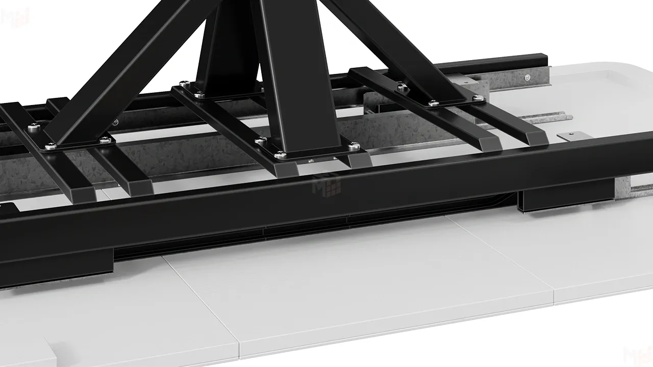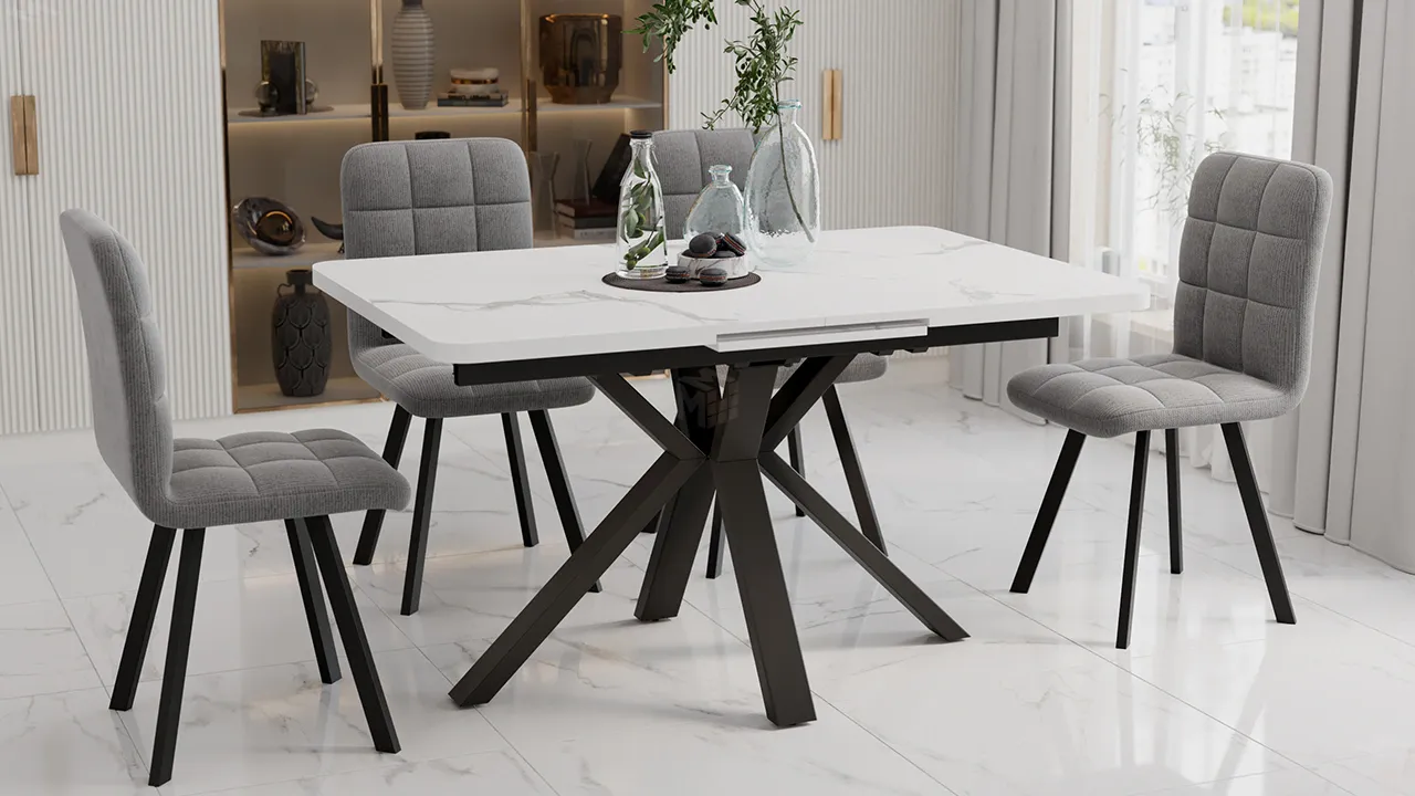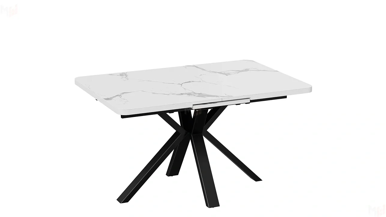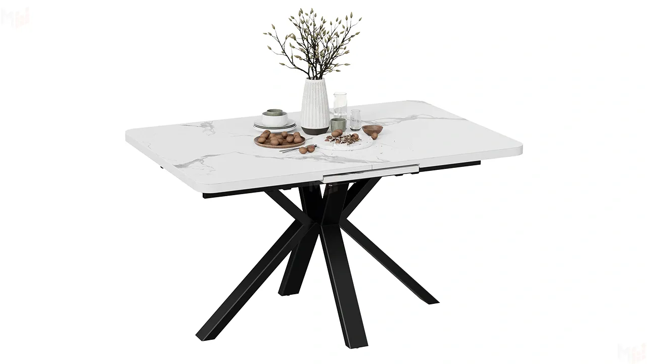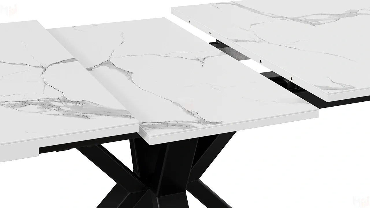 Столешница оснащена раздвижным синхронным механизмом с автоматическим подъемом вставки стола "BAUT", при необходимости ее можно с легкостью разложить, увеличив поверхность в размерах. В основании ножек есть регулируемые подпятники для возможной корректировки стола по высоте.