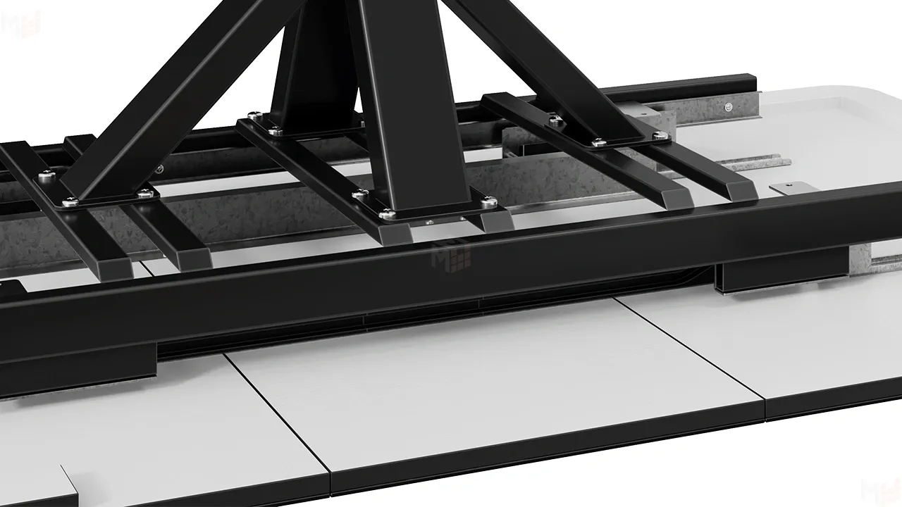 Столешница оснащена раздвижным синхронным механизмом с автоматическим подъемом вставки стола "BAUT", при необходимости ее можно с легкостью разложить, увеличив поверхность в размерах. В основании ножек есть регулируемые подпятники для возможной корректировки стола по высоте.