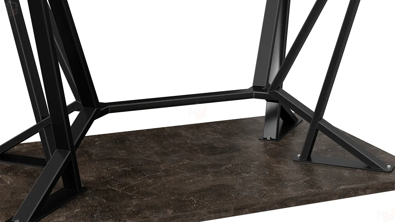 Столешница прямоугольной формы изготовлена из ЛДСП 22 мм с обработкой торцов кромкой ABS 2 мм. Опора нестандартной формы выполнена из металла, покрытого порошковой краской «Черный муар». Каждая ножка представляет собой элегантный треугольник, что добавляет геометрическую красоту и лаконичность в дизайн стола. Опора обеспечит стабильность и надежность конструкции.