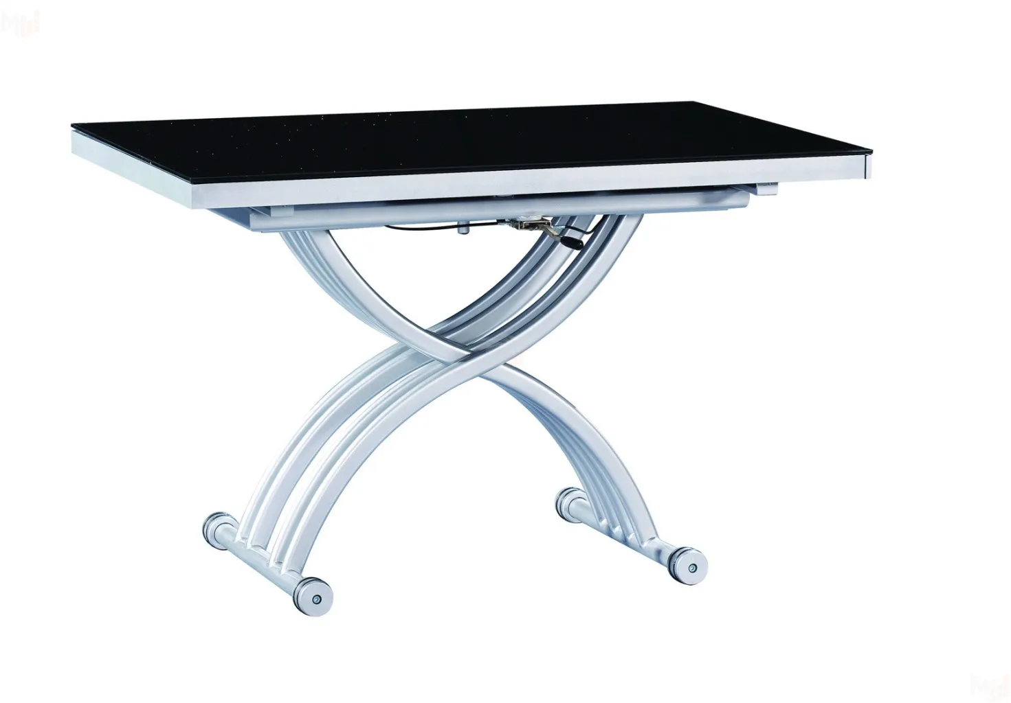 Трансформация - из-под верхней столешницы выдвигаются независимо друг от друга в противоположные стороны два подстолья с вкладными элементами, одна часть одного из вкладных элементов поворачивается вместе со скалкой и ложится на продольную царгу, далее вторая половина вкладного элемента откидывается на петле и ложится на другую продольную царгу. Столешница - стекло черное или белое