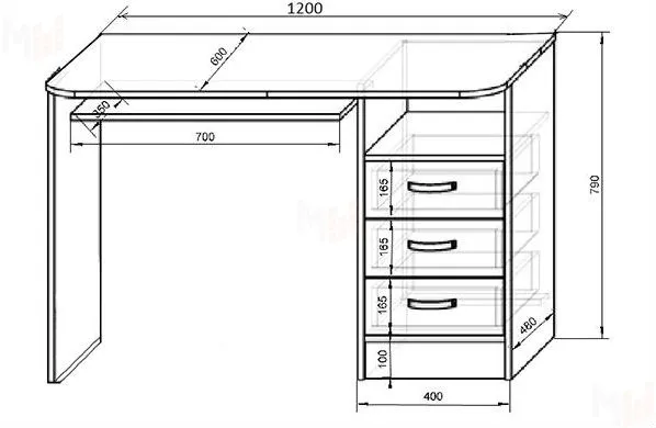 Стол Капитан имеет стандартную конструкцию: встроенная тумба сбоку, полка выкатная под столешницей, длина рабочей поверхности рабочей - 120 см.