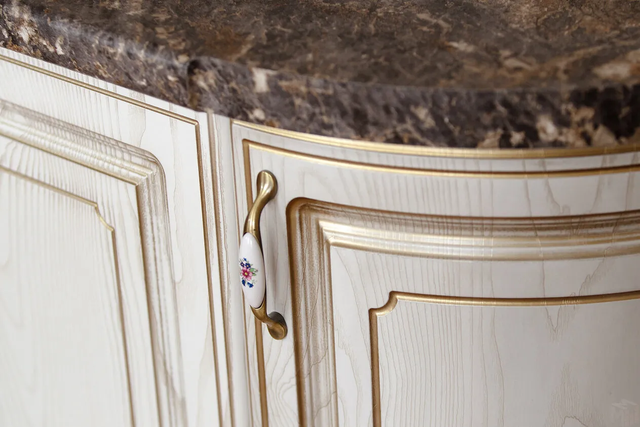 Фасады выполнены из МДФ, окрашены, патина нанесена вручную, сверху защищены матовым итальянским лаком.