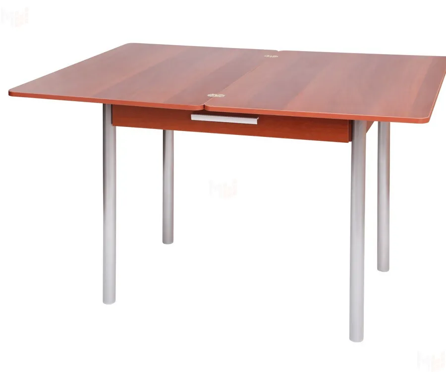 Стол компактен – в сложенном виде его габариты 900х600мм, а при желании легко раскладывается в большой, за которым легко может уместиться большая компания. Встроенный ящик стола очень удобен для ножей, вилок, мелкой кухонной утвари. Материал столешницы ЛДСП – гигиеничный, легко моющийся и термостойкии, к тому же не боится пятен от кофе, вина, пищевых продуктов. Торцы покрыты пластиковой кромкой, что помимо эстетики повышает травмобезопасность. Ножки стола крепятся к раме при помощи специальных болтов, чтобы при необходимости стол можно было легко разобрать и транспортировать. При этом стол может быть укомплектован как прямыми, так и изогнутыми ножками, придающими столу помимо оригинальности дополнительную устойчивость.