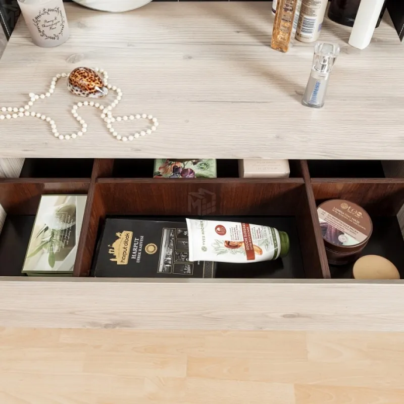 Туалетный столик просто необходим красивой женщине, которая привыкла за собой ухаживать не бегом, в ванной или прихожей, а обстоятельно. Стильный и функциональный он не займет много места в маленькой спальне. Разместите его в спальне у окна, и лучший естественный свет вам обеспечен. Ящики оснащены шариковыми направляющими, что обеспечивает их движению плавных ход и минимальный люфт.