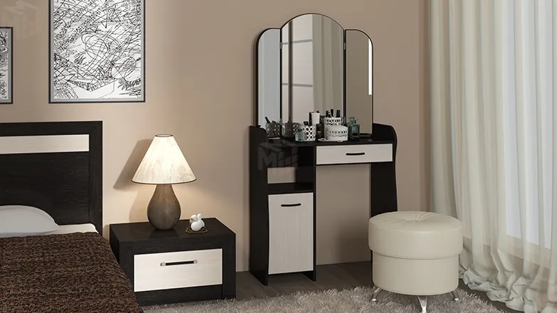 Столик туалетный София Т1 прекрасно впишется в интерьер вашей спальни или гостиной. Он имеет современный дизайн и вместительные выдвижные ящики для косметики и туалетных принадлежностей. Также в нем есть тумба с полочкой, куда вы сможете положить необходимые для утреннего туалета вещи.