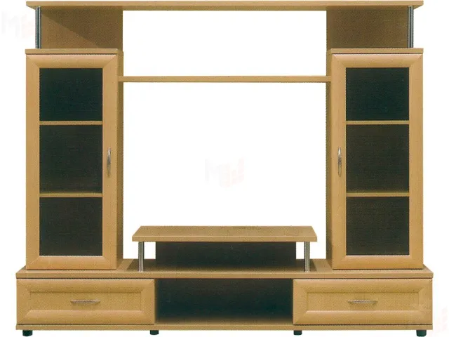 Одноуровневая стойка для телевизора и аппаратуры позволит разместить домашний кинотеатр, коллекцию фильмов и много другого. Два пенала по бокам имеют вместительные полки и стеклянные дверцы. Имеется 7 цветовых решений.