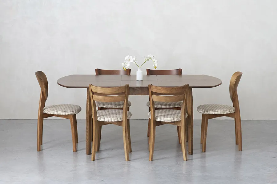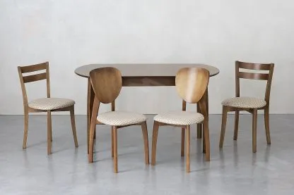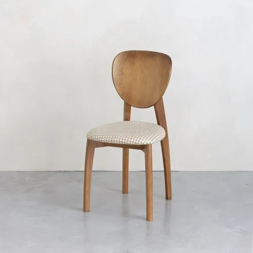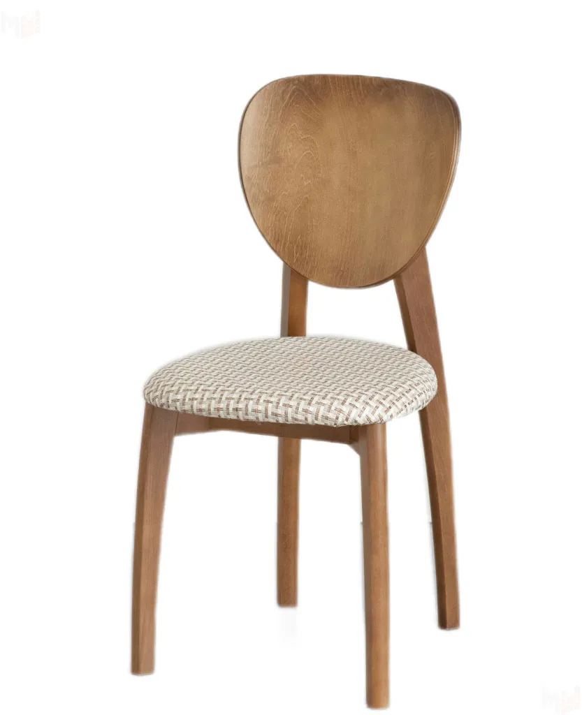 Каркас стула выполнен из массива дерева. Сиденье покрыто мягким слоем наполнителя и обшито текстилем, удобная спинка необычной круглой формы.