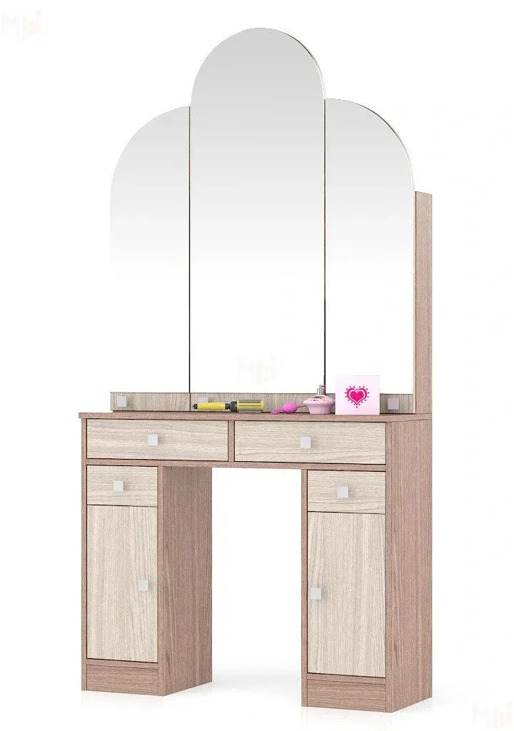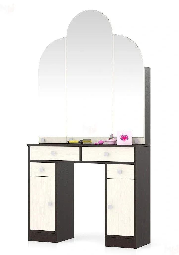Трельяж с зеркалом, с двумя тумбами, закрытыми отделениями и множеством ящиков. Цвет на выбор: венге/дуб молочный, ясень шимо темный/светлый.