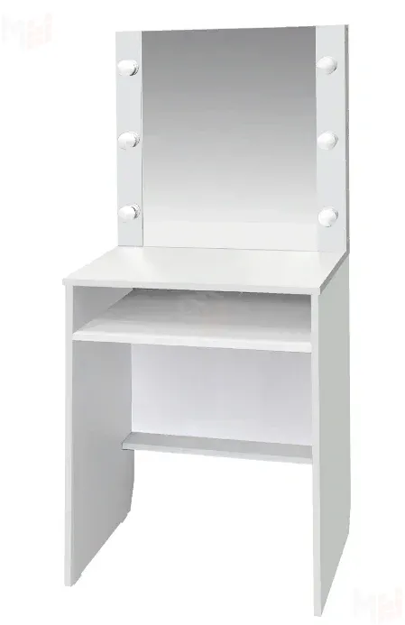 Изготовлен из ЛДСП 16 мм. Ящики выдвигаются с помощью направляющих полного выдвижения. Цвет белый. Рассчитан на 6 лампочек. Размер зеркала 460*600 мм.
