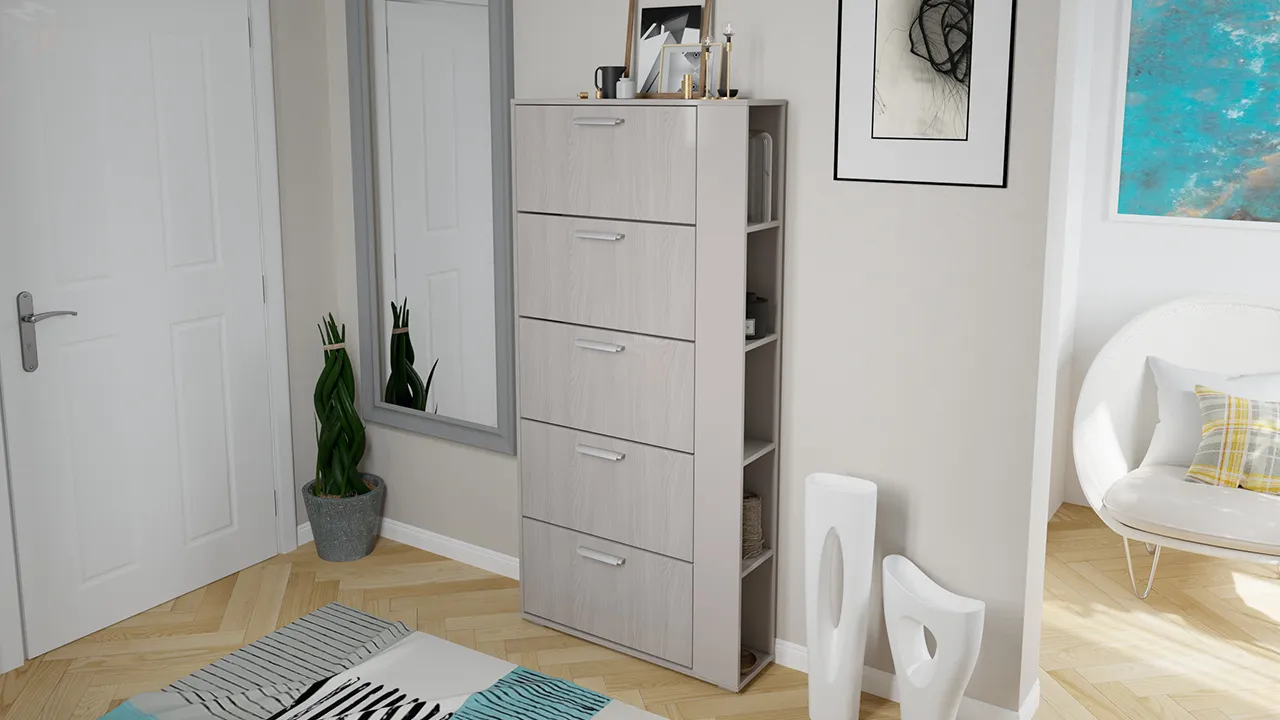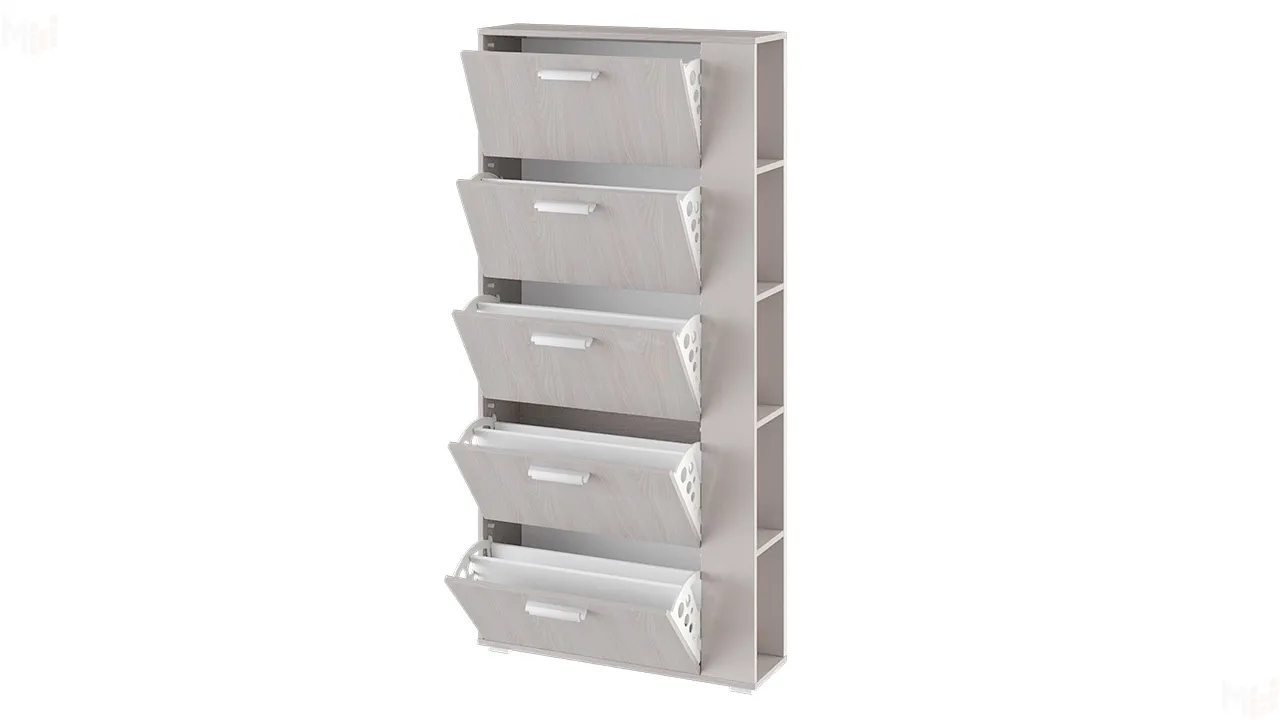 Откидные секции обувницы оснащены откидным механизмом с пластиковыми стенками.