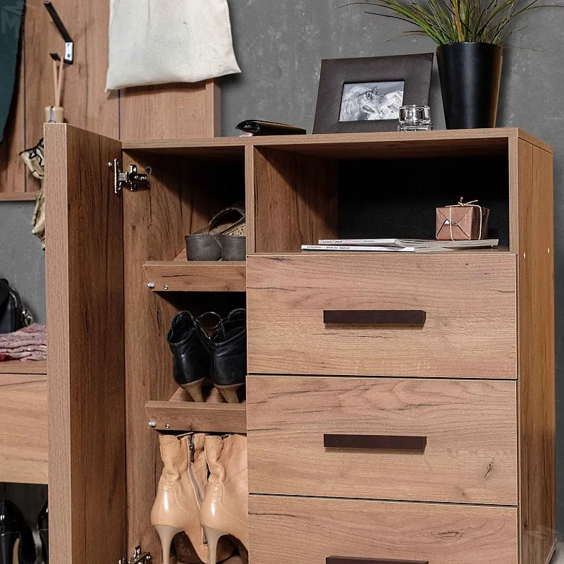 Комбинированная тумба для обуви Nature 89 - удобная и продуманная система хранения обуви для всей семьи. Тумба состоит из трех выдвижных ящиков и отделением за распашной дверцей. За распашным фасадом Контур находятся две полки для хранения обуви, которые находятся наискосок. Полки регулируются по высоте, для этого полкодержатели необходимо установить в подготовленные отверстия. Модуль можно собирать как на левую, так и правую сторону.