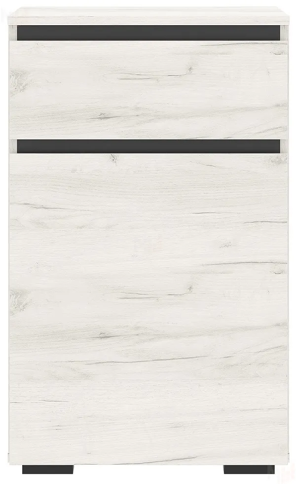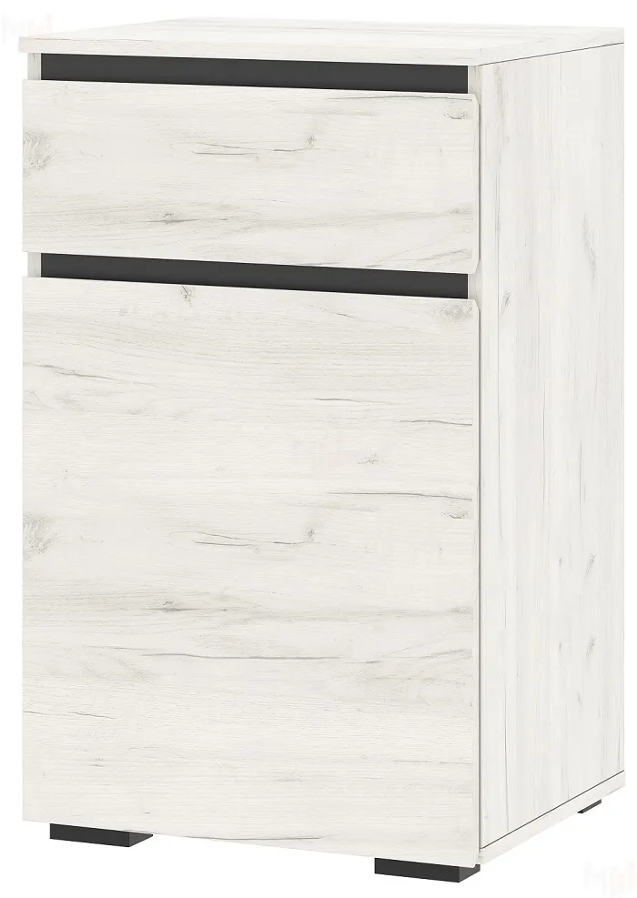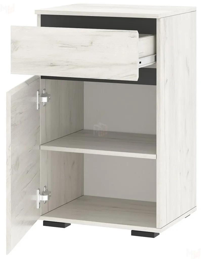 Тумба 1С1Я ГРЕТТА 1-створчатая с полкой, с ящиком на направляющих полного выдвижения. Применение интегрированной ручки на фасадах делает модель стильной и безопасной – дверцы открываются за профилированные выступы. Фасады обработаны кромкой 1 мм. Черная регулируемая ножка-опора.