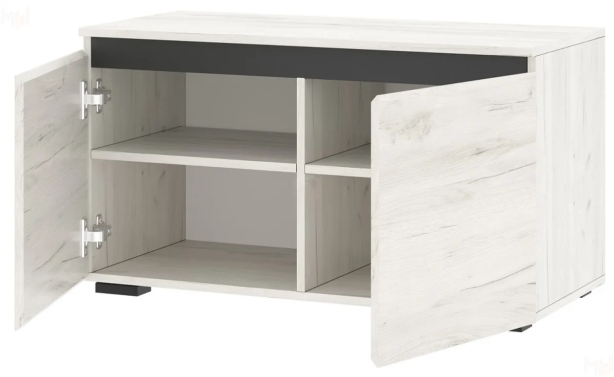 Тумба 900 "ГРЕТТА" с распашными фасадами и полками. Применение интегрированной ручки на фасадах делает модель стильной и безопасной – дверцы и ящик открываются за профилированные выступы. Фасады обработаны кромкой 1 мм. Чёрная регулируемая ножка-опора.