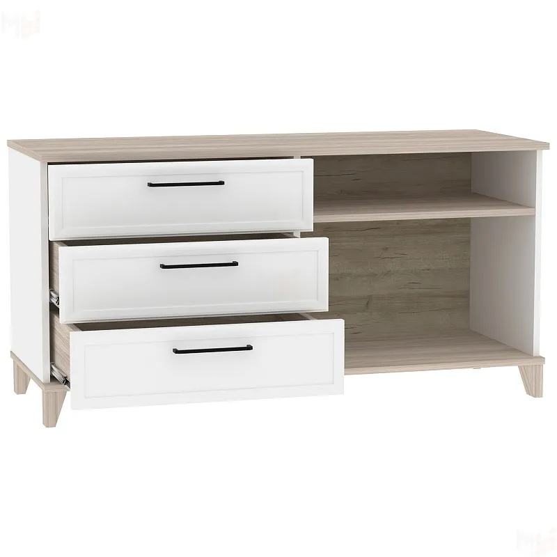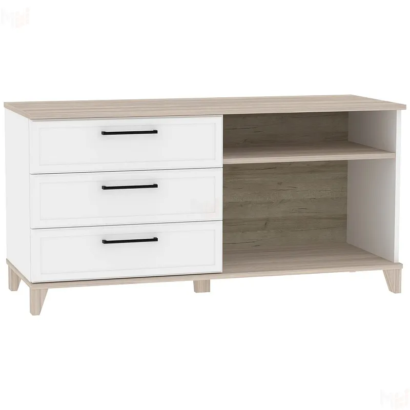 AURELIO 5 Тумба МЦН в паре с AURELIO 13 Стол консольный - полноценное рабочее место в гостиной. Также Тумбу МЦН можно использовать как ТВ-тумбу в гостиной, как место для хранения сезонных аксессуаров в прихожей, а в спальне она пригодится для организации хранения белья. Тумба на опорах из МДФ высотой 80 мм. Шариковые направляющие полного выдвижения в ящиках обеспечивают плавный, мягкий, бесшумный ход на протяжении всего срока эксплуатации. Донья ящиков в древесном декоре придают мебели коллекции Aurelio дополнительную эстетику.