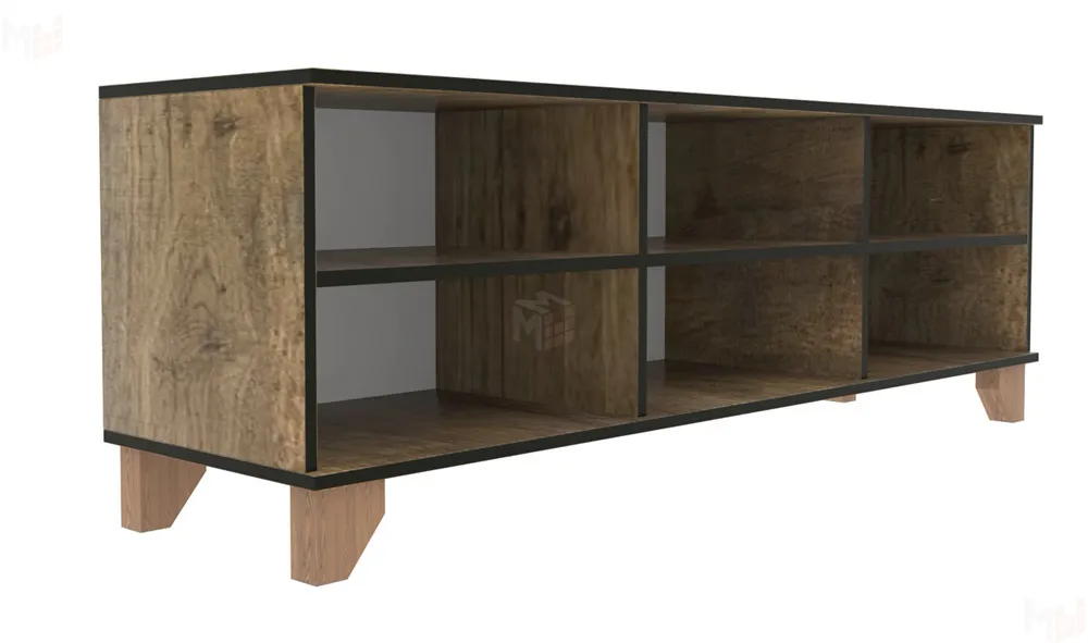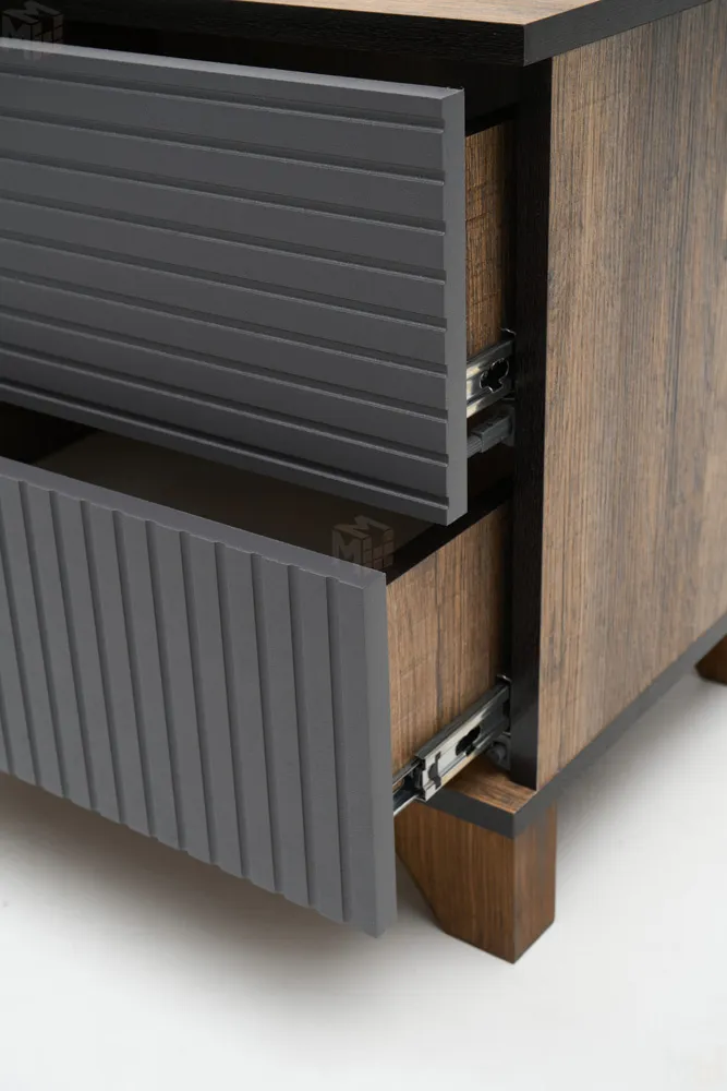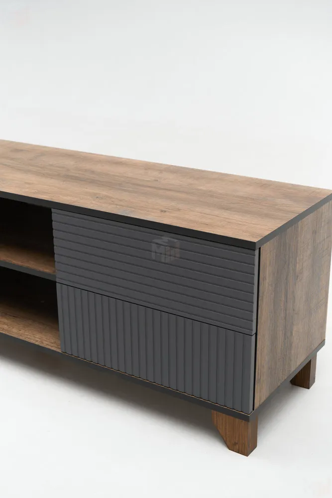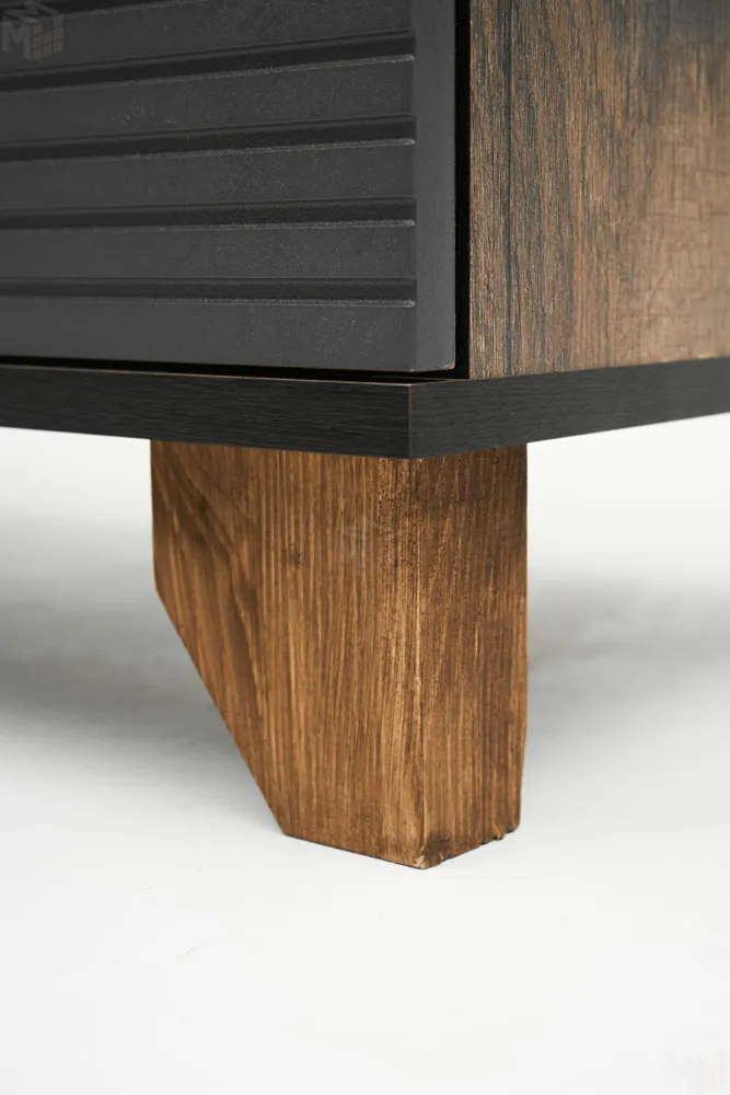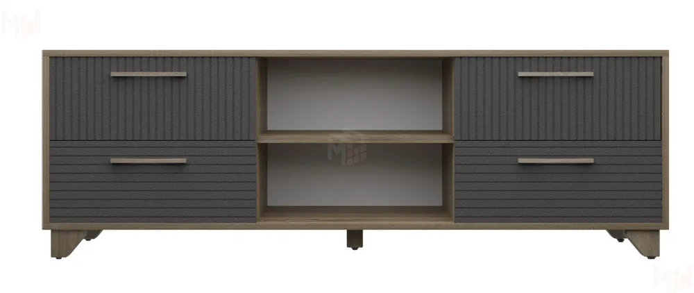 Тумба под ТВ — это необходимый предмет мебели для гостиной. Она занимает центральное место и выполняет важную функцию: размещение телевизора, ТВ-аксессуаров, личных вещей. Данная модель оснащена боковыми выдвижными ящиками на шариковых направляющих полного выдвижения. Ящики укомплектованы ручками из натурального дуба. Между ящиками располагается открытая ниша с двумя полками. Ножки изделия выполнены из массива дерева и имеют регулировку по высоте. Для подбора изделия под интерьер, возможна комбинация сочетания цветов корпуса и фасада. -