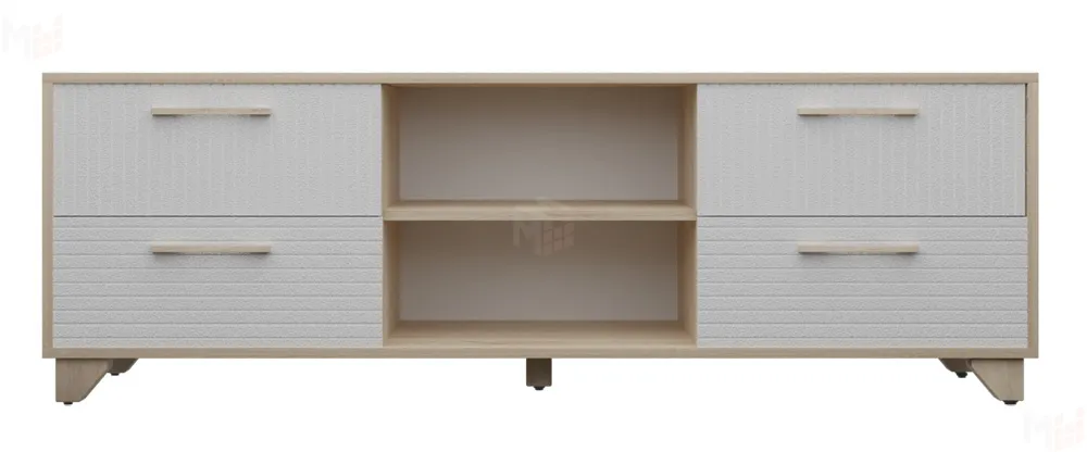 Тумба под ТВ — это необходимый предмет мебели для гостиной. Она занимает центральное место и выполняет важную функцию: размещение телевизора, ТВ-аксессуаров, личных вещей. Данная модель оснащена боковыми выдвижными ящиками на шариковых направляющих полного выдвижения. Ящики укомплектованы ручками из натурального дуба. Между ящиками располагается открытая ниша с двумя полками. Ножки изделия выполнены из массива дерева и имеют регулировку по высоте. Для подбора изделия под интерьер, возможна комбинация сочетания цветов корпуса и фасада. -