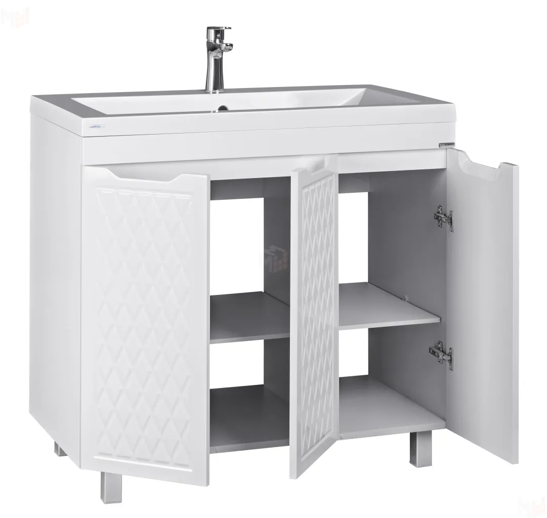 Тумба под умывальник 3D ANDREA 90 имеет два отсека с полками. Один большой (две дверцы), второй - поменьше (одна дверца).