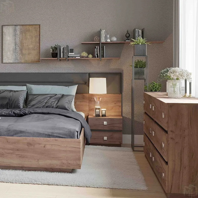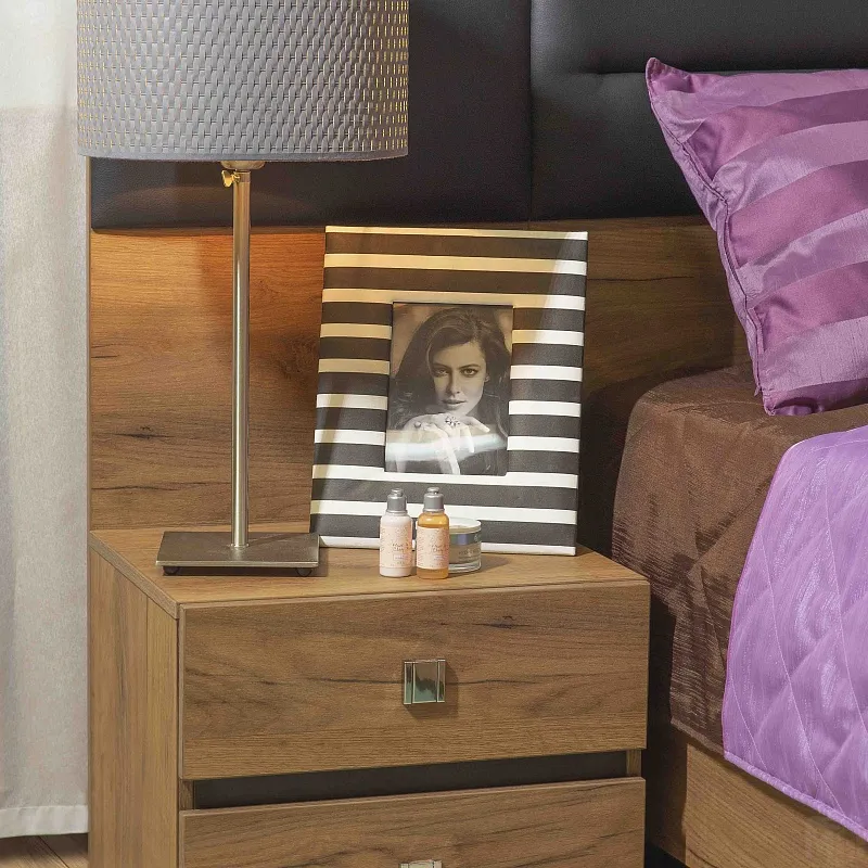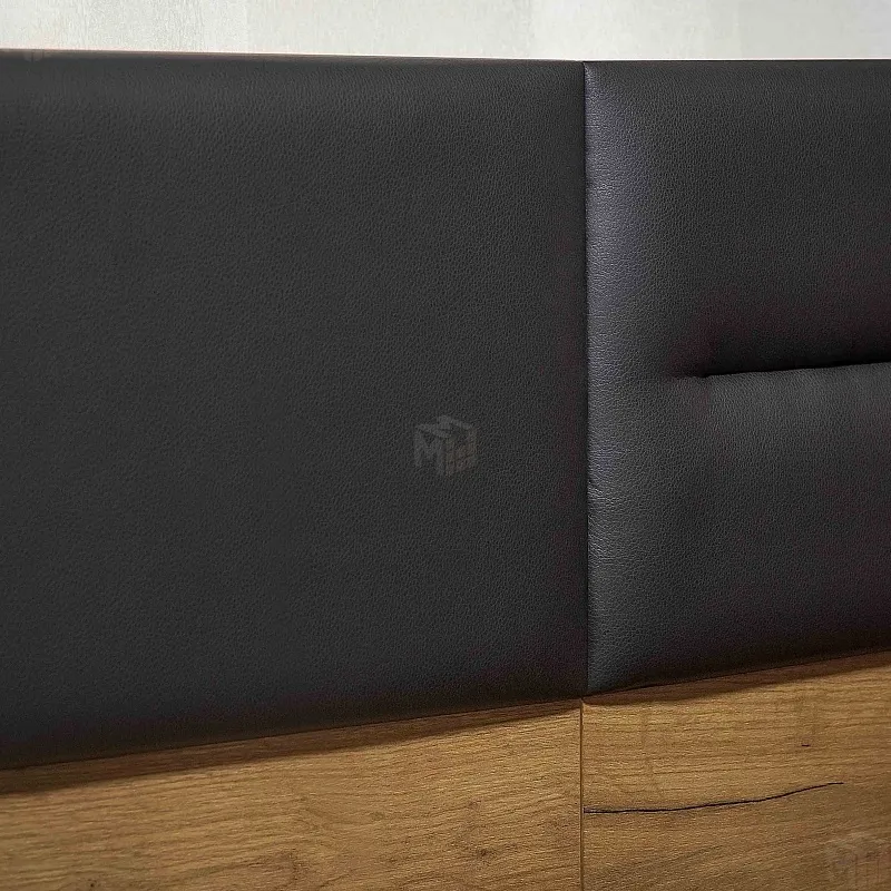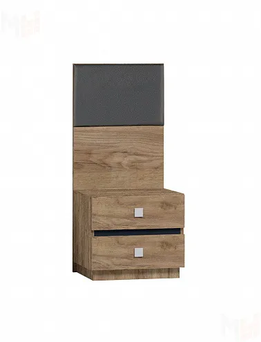 Прикроватная тумба NEO 41 с двумя выдвижными ящиками и высокой мягкой спинкой – красивый и функциональный модуль. Изюминка тумбы - комбинированная задняя стенка, возвышающаяся над столешницей: ее нижняя часть из ЛДСП, а верхняя с подушечкой из экокожи черного цвета. Когда тумба приставлена к кровати, тогда она составляет единую композицию с изголовьем. Дополняют тумбу интересные ручки на ящиках: в обычном состоянии - это плоские прямоугольные кнопки, а при необходимости выдвинуть ящик средняя часть приподнимается кончиками пальцев.