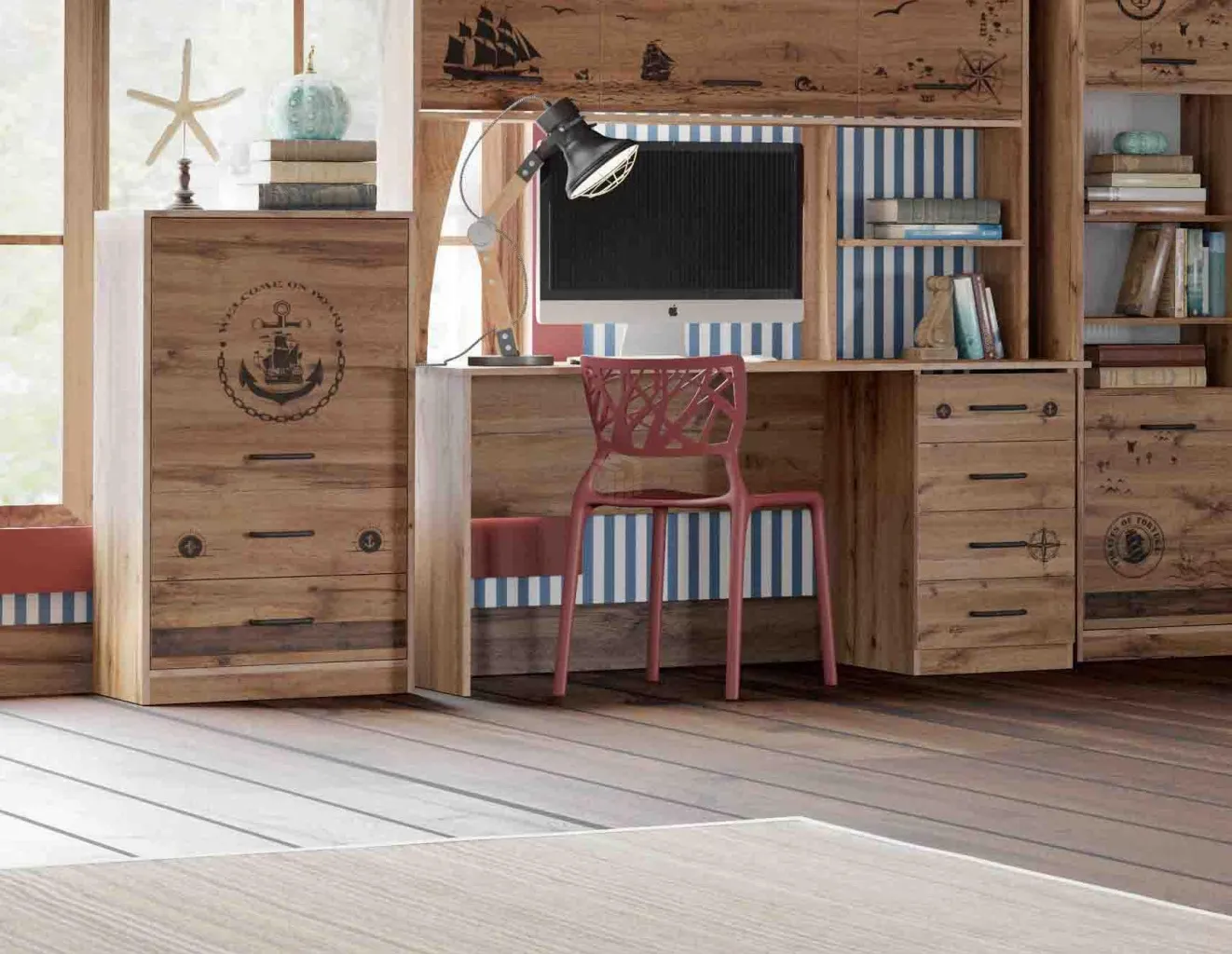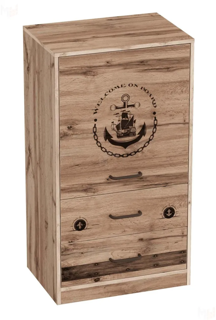При оформлении детской на первый план выходит рациональное использование полезного пространства, ведь здесь ребенок не только отдыхает, но и играет, делает уроки, занимается творчеством и спортом. Наши дизайнеры при создании коллекций продумывают каждую деталь, опираясь на актуальные тенденции. Тумба с дверцей и ящиками «Фрегат» — один из примеров идеального сочетания практичности, оригинальности и долговечности. Цветовое исполнение подходит сразу для нескольких стилей, а габариты — для комнат разной площади. Мебель для детской создается из безопасных материалов с отличной износостойкостью.