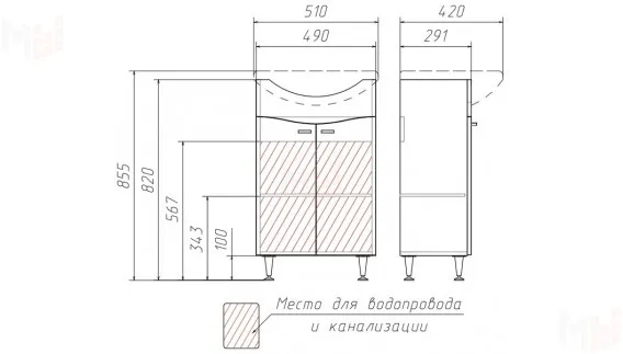 ширина 490 мм, глубина 291 мм, высота 820 мм