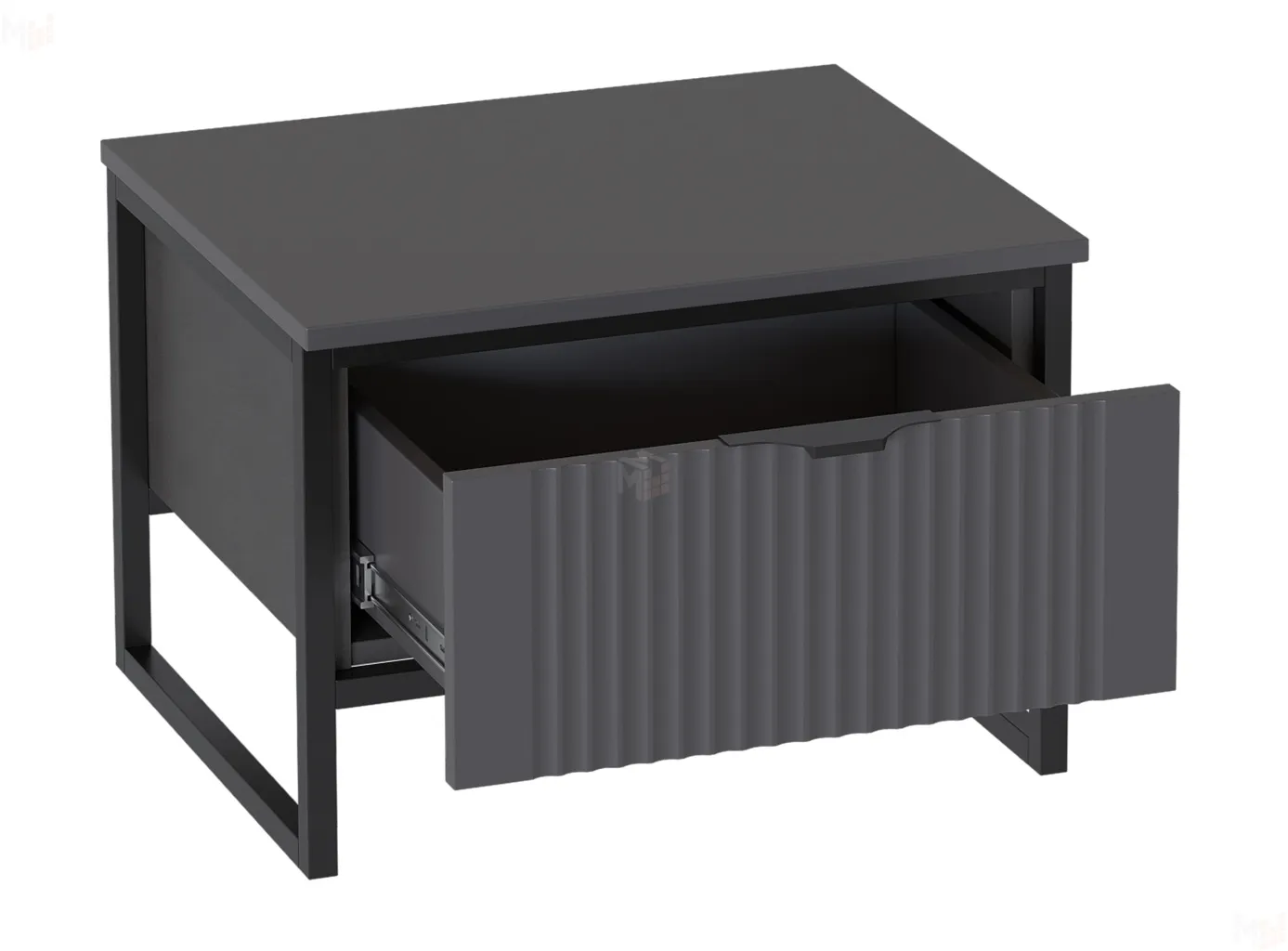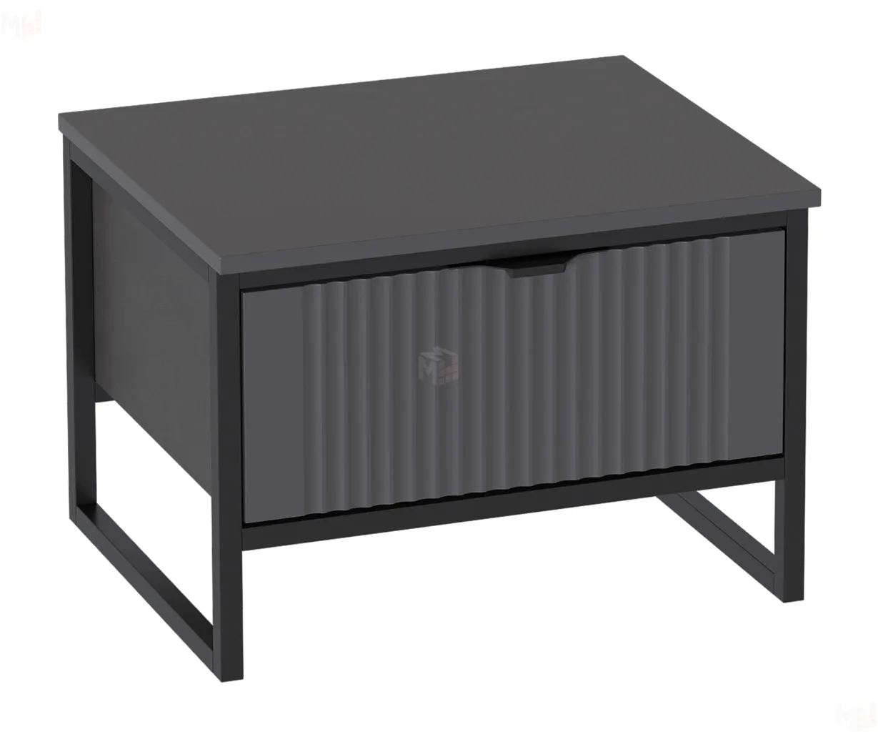 Дизайн коллекции гармонирует со стилем минимализм и лофт. Корпус изделий выполнен из качественного ЛДСП 16 мм цвета "Металл Бруклин", фасады из МДФ 16 мм цвета "Графит". Толщина металлических опор - 20 мм. -