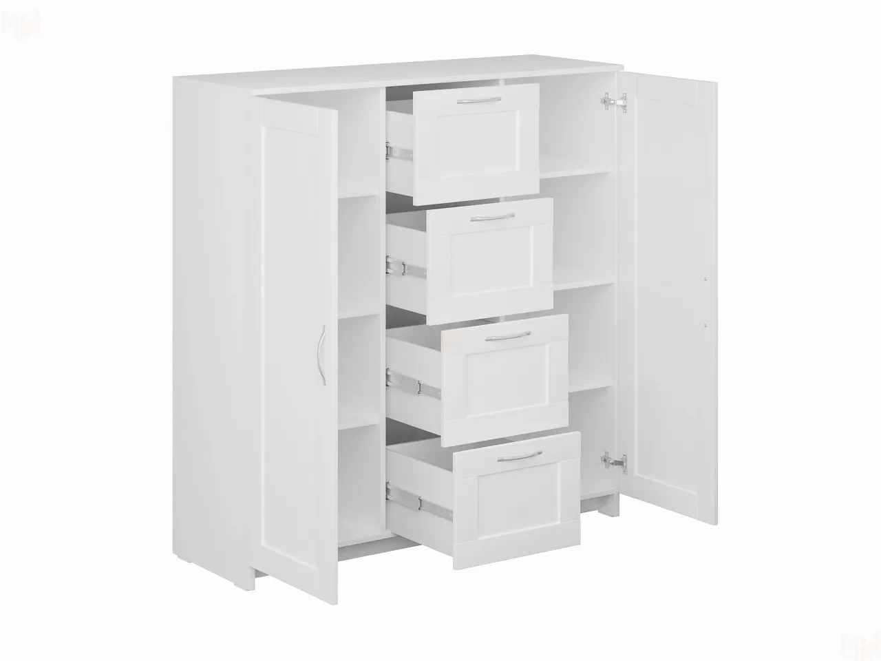 Тумба Сириус 2 двери и 4 ящика выполнена из КДСП толщиной 16 мм белого цвета.