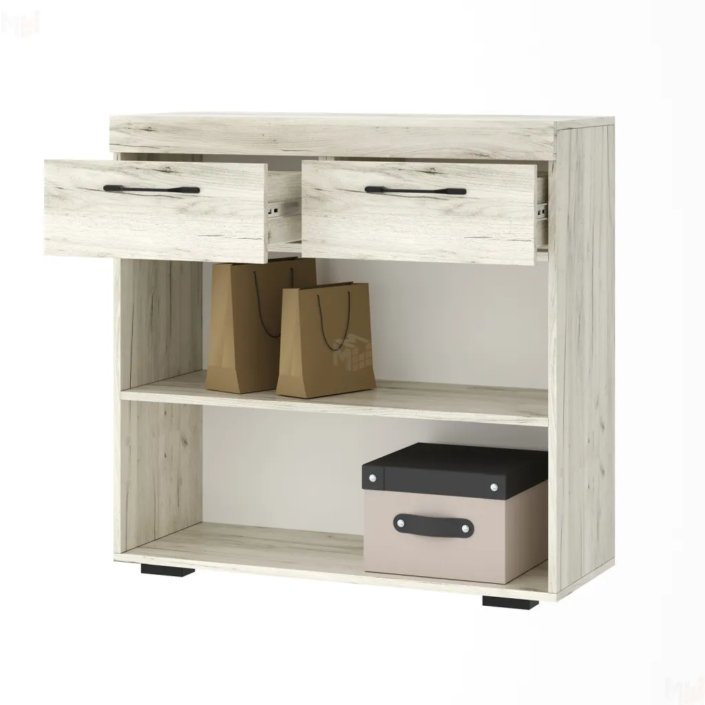 Тумба ТС-900 "СОНАТА" двустворчатая с полкой и 2-мя ящиками на направляющих полного выдвижения. Устанавливается стильная металлическая ручка, чёрная, матовая. Верхняя часть тумбы обрамлёна профилем MDF. -