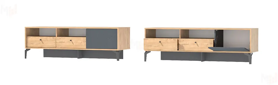 Тумба имеет два выдвижных ящика, открытые и закрытое отделение.
