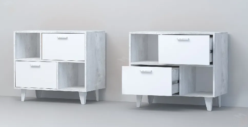 Тумба оснащена двумя ящиками на шариковых направляющих полного выдвижения и двумя открытыми нишами.