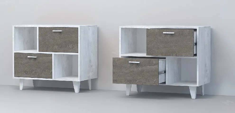 Тумба оснащена двумя ящиками на шариковых направляющих полного выдвижения и двумя открытыми нишами.