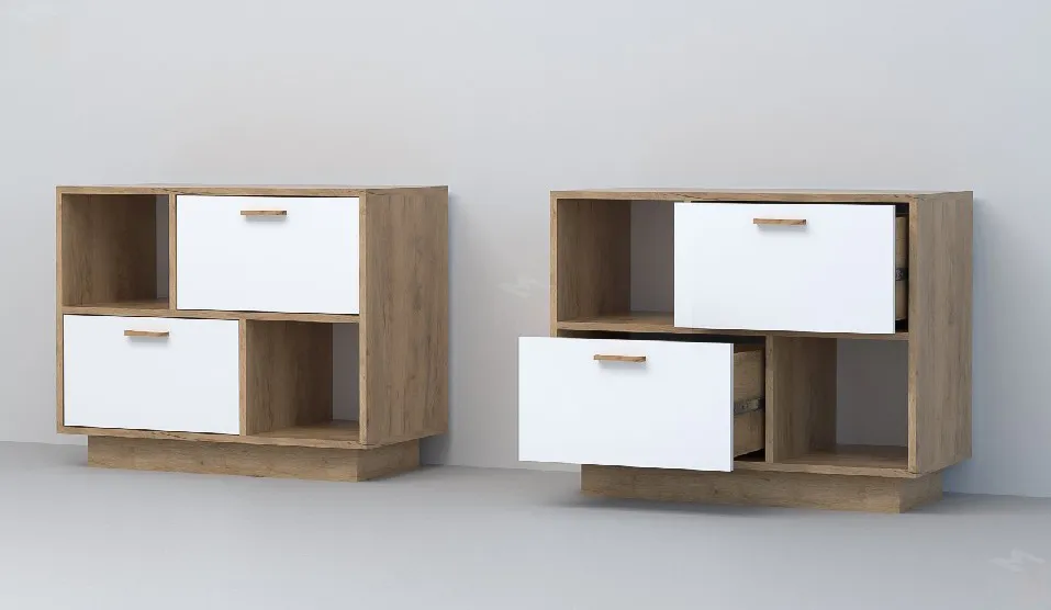 Тумба оснащена двумя ящиками на шариковых направляющих полного выдвижения и двумя открытыми нишами.