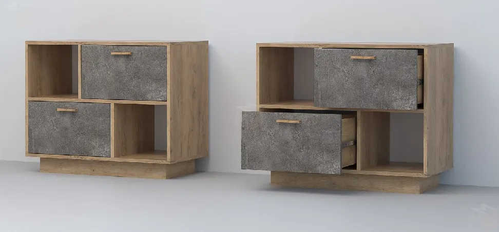 Тумба оснащена двумя ящиками на шариковых направляющих полного выдвижения и двумя открытыми нишами.
