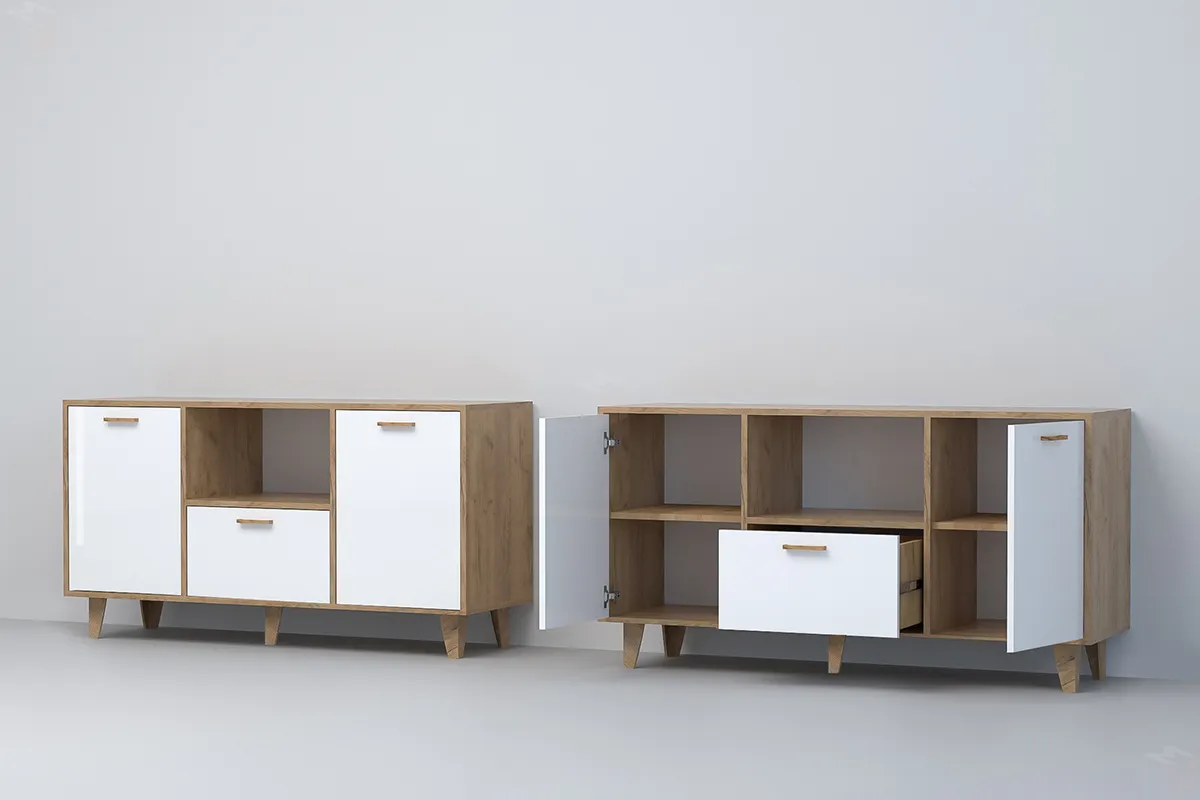 Тумба под аппаратуру оснащена выдвижным ящиком на шариковых направляющих полного выдвижения, двумя распашными дверками и открытой нишей.