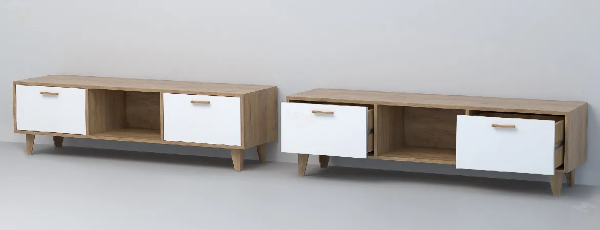 Тумба под аппаратуру оснащена двумя выдвижными ящиками на шариковых направляющих полного выдвижения и открытой нишей.