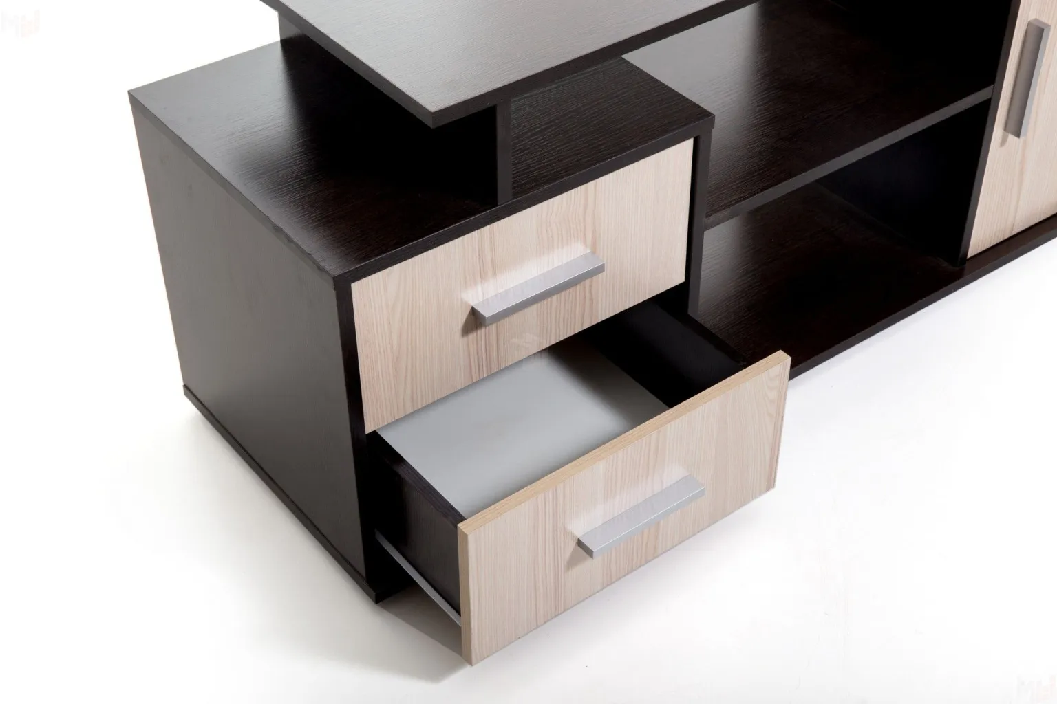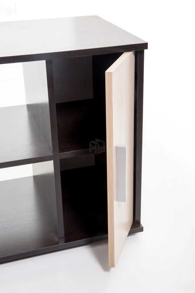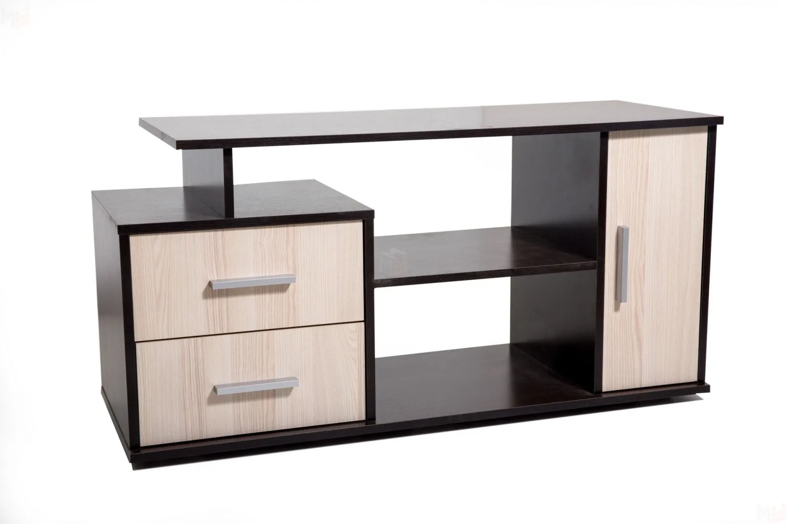 Удобная телевизионная тумба с открытыми полками для аудио/видео-аппаратуры, закрытыми полками и вместительным выдвижным ящиком.