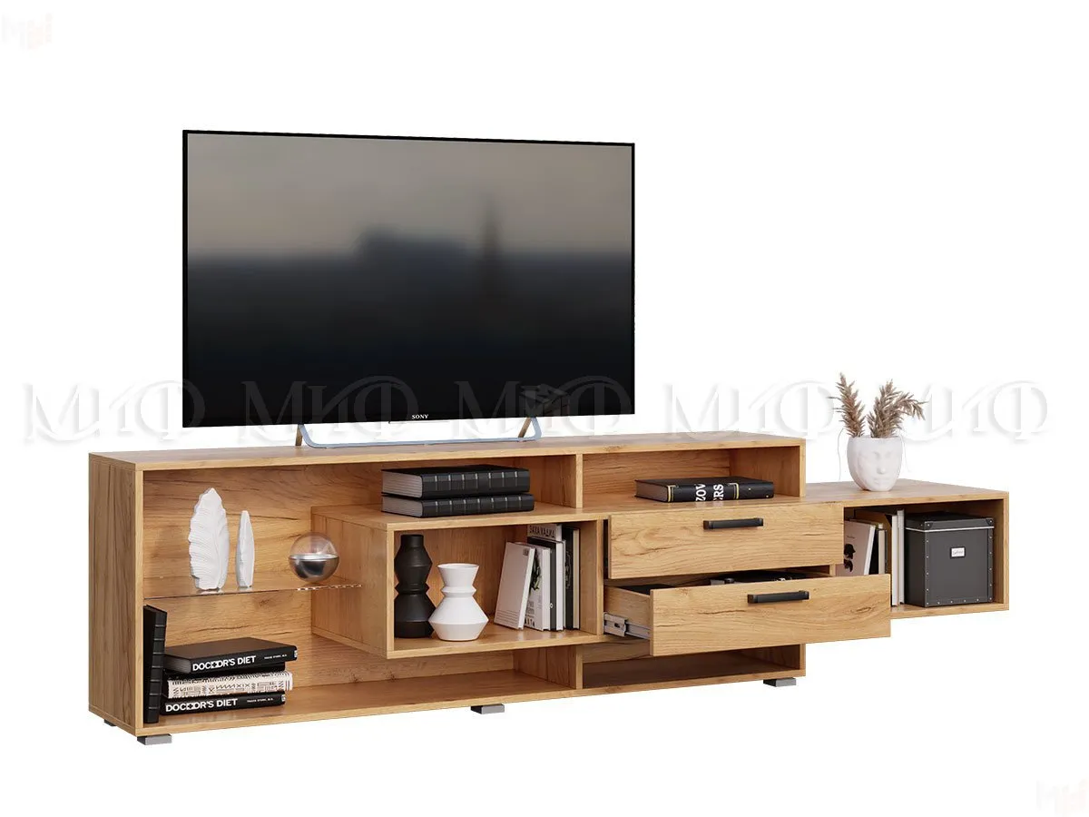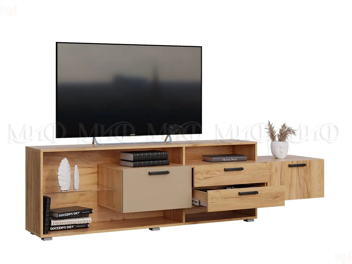 Каркас тумбы ТВ выполнен из ЛДСП Дуб золотой крафт, фасады ЛДСП Бежевый.