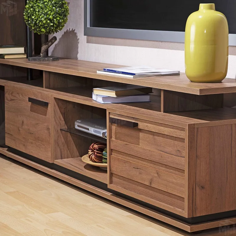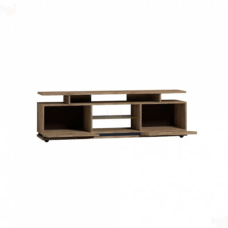 Стильная и аккуратная тумба приятного древесного оттенка гармонично впишется в интерьер гостиной в стиле Лофт. Визуально легкая конструкция не загромождает пространство и делает его более функциональным. Комбинированный вариант открытых полок со шкафчиками с глухими фасадами отлично подойдет для размещения многочисленной видеоаппаратуры, дисков и журналов. Благодаря вытянутой форме тумбы на ней без труда поместится телевизор с диагональю до 75'', а две удобные распашные дверцы позволят убрать от посторонних глаз личные вещи.