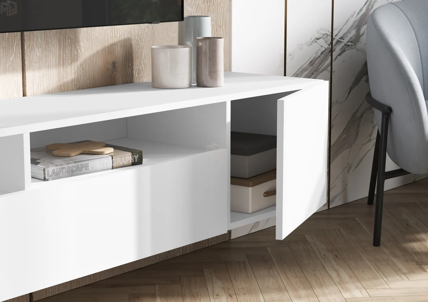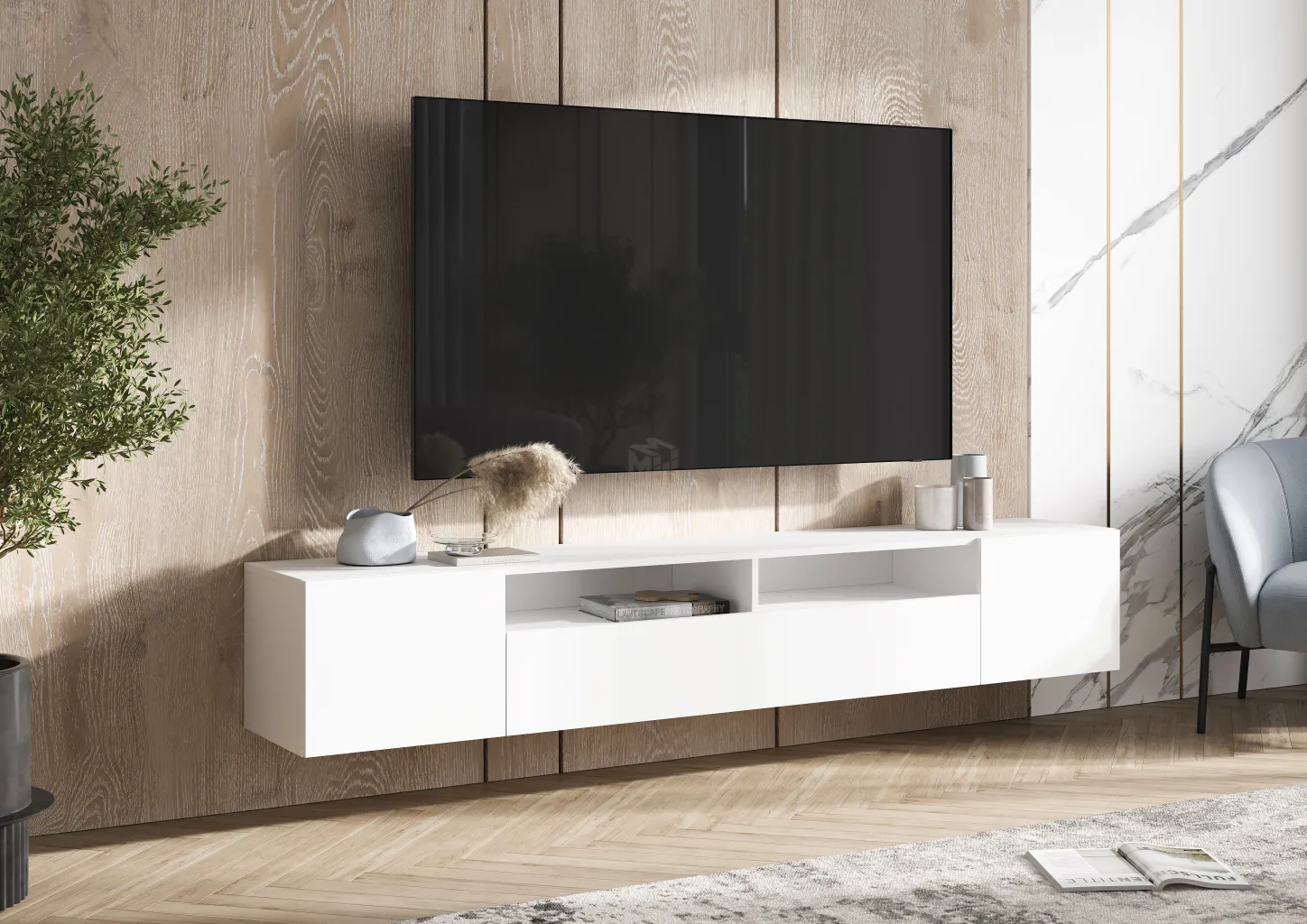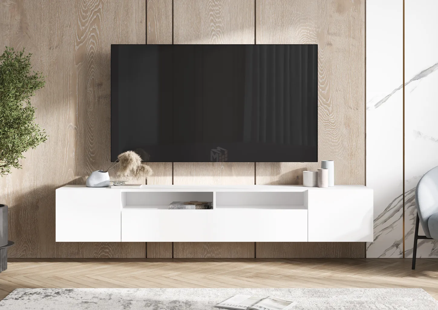Стильная тумба ТВ «Сити» - универсальная модель, которая крепится как к стене так и можно поставить на пол (опоры идут в комплекте, вся фурнитура находится внутри упаковки).
