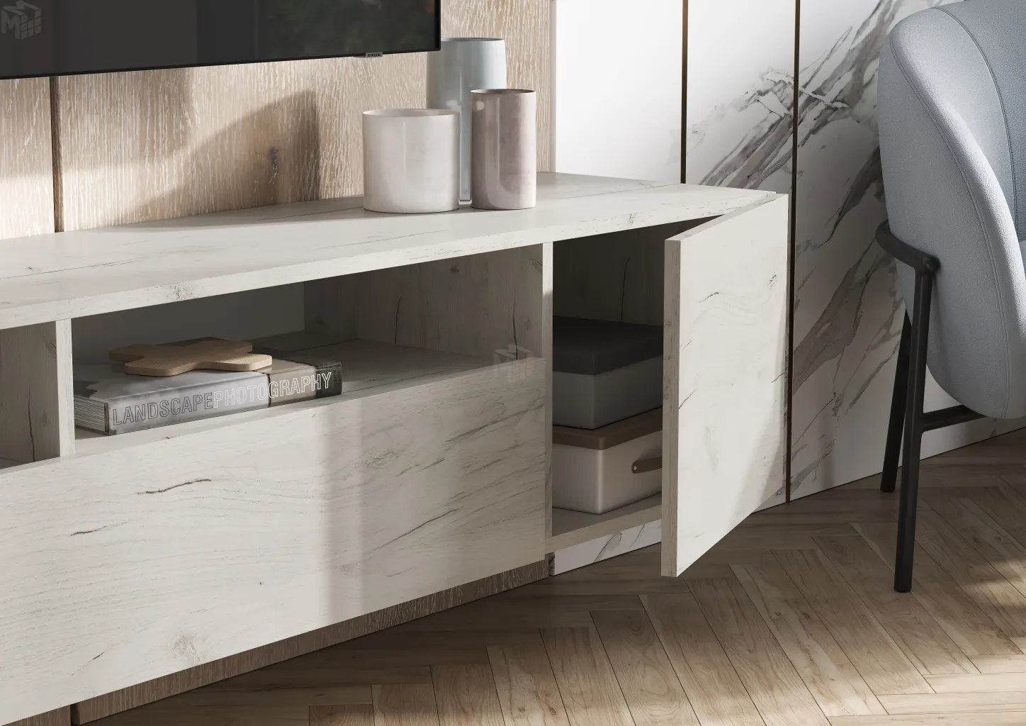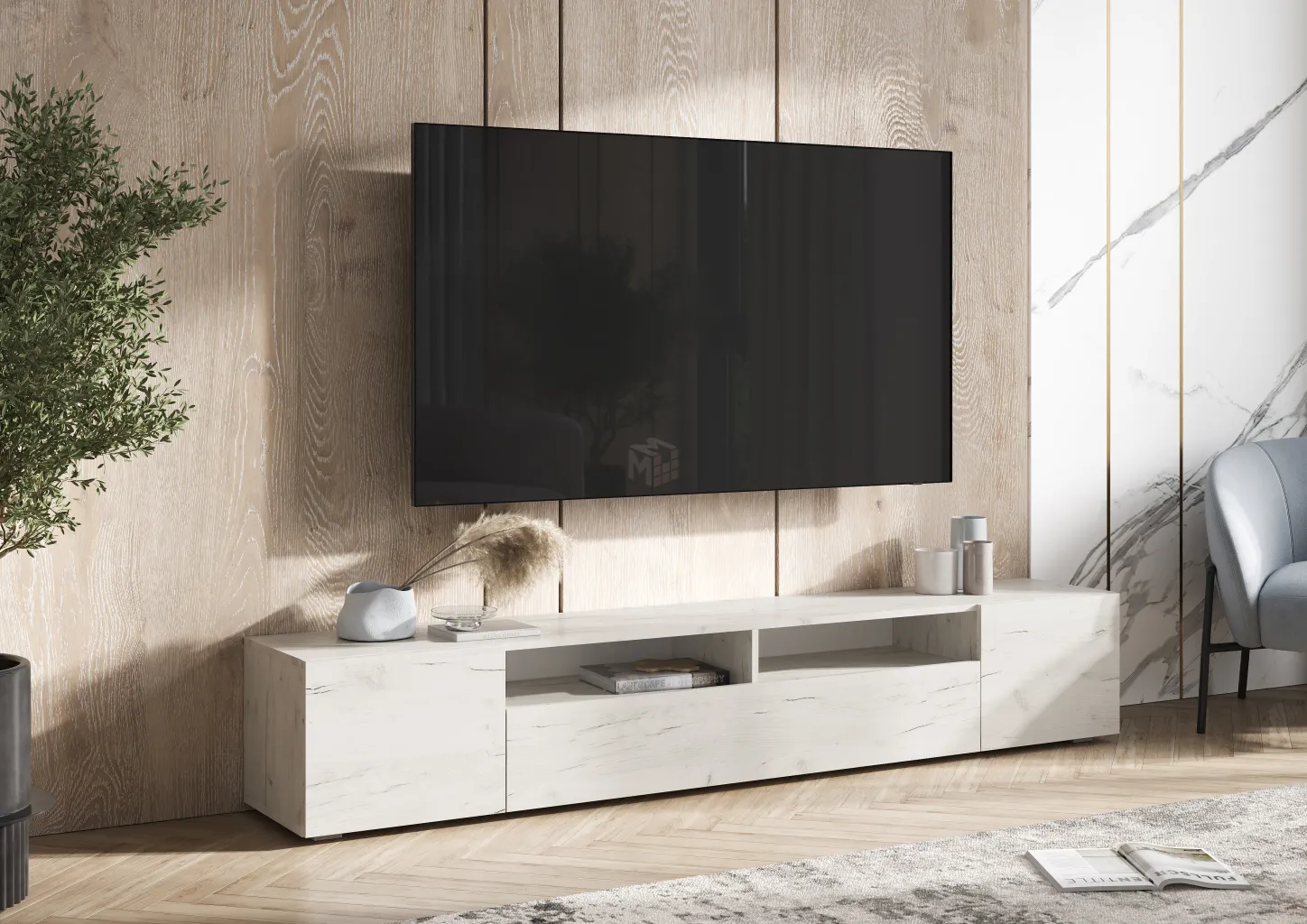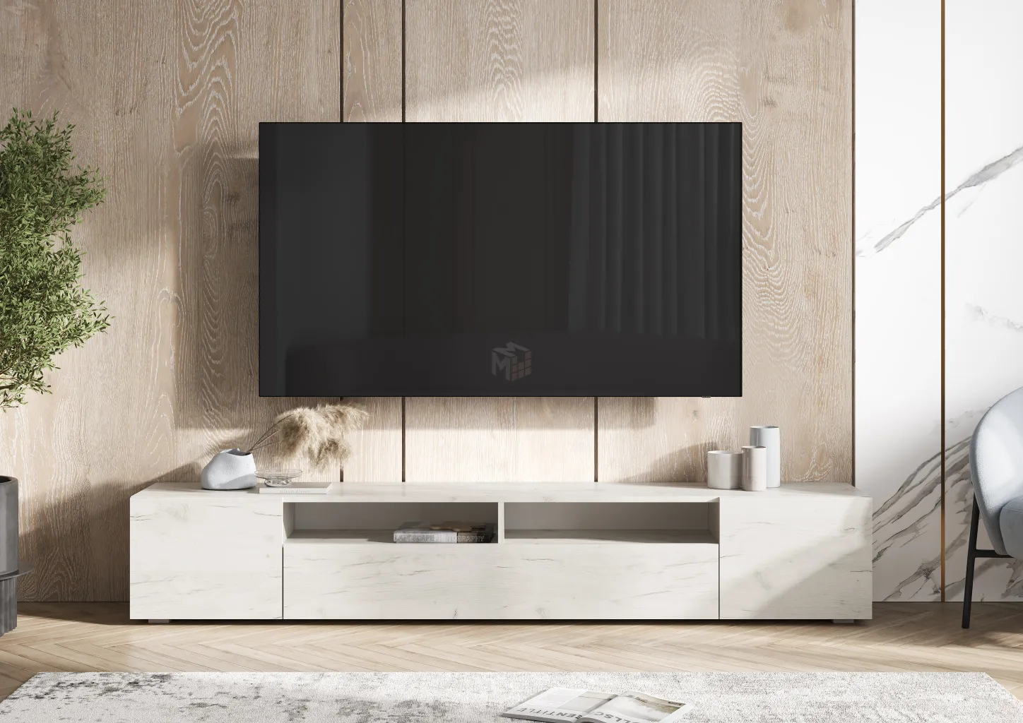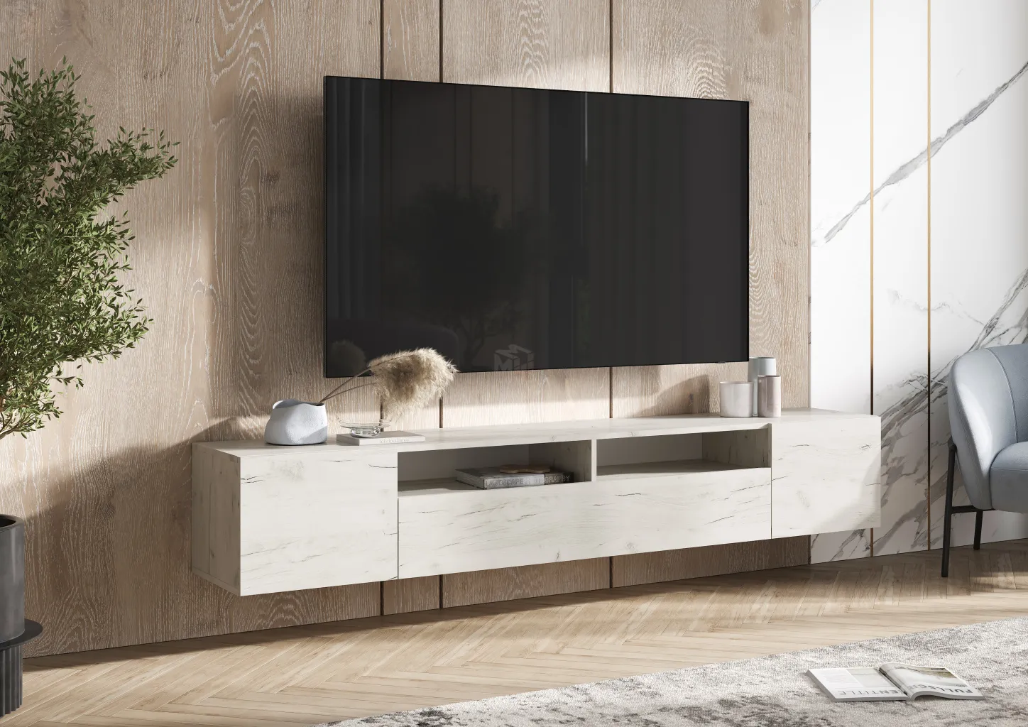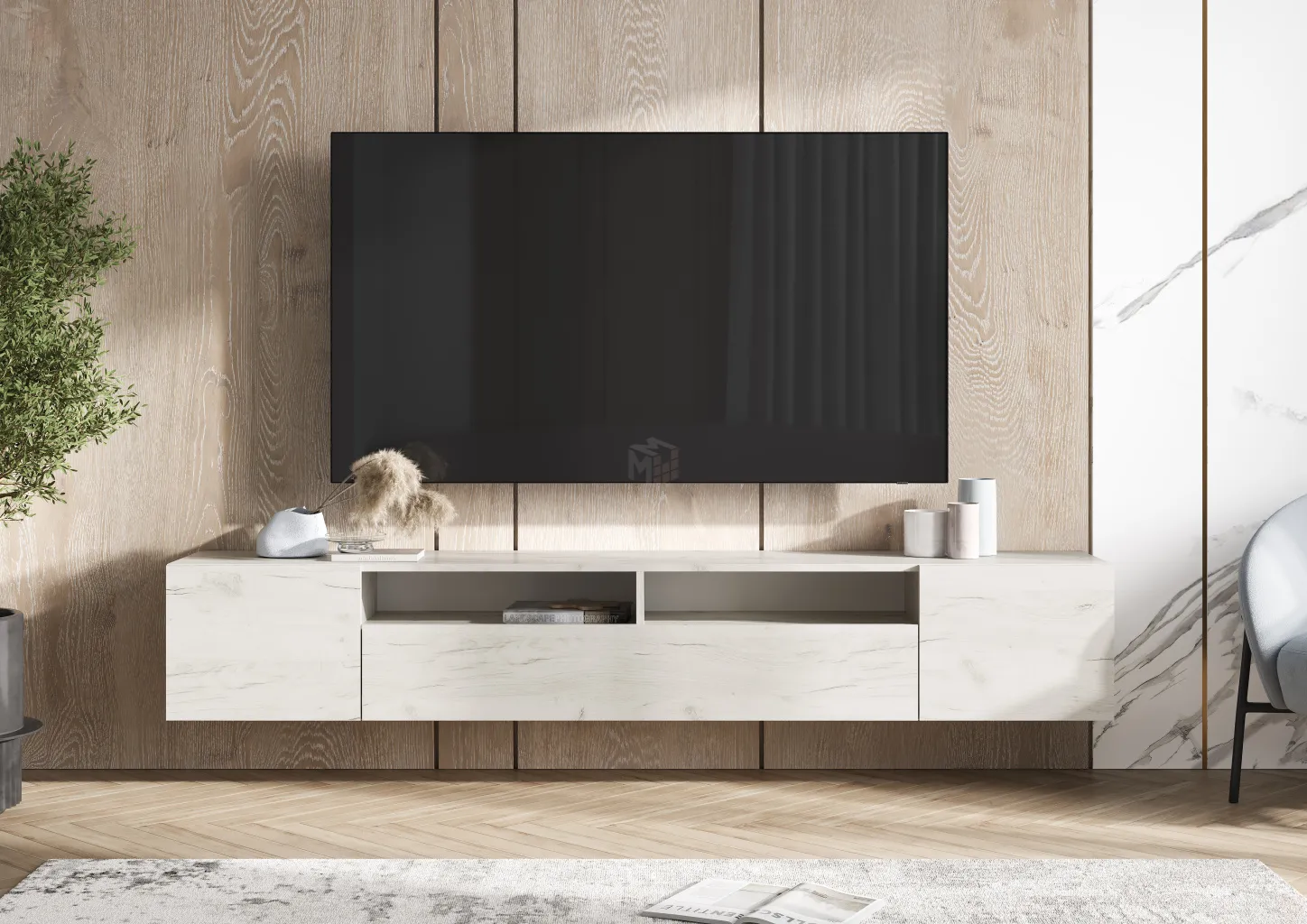 Стильная тумба ТВ «Сити» - универсальная модель, которая крепится как к стене так и можно поставить на пол (опоры идут в комплекте, вся фурнитура находится внутри упаковки).